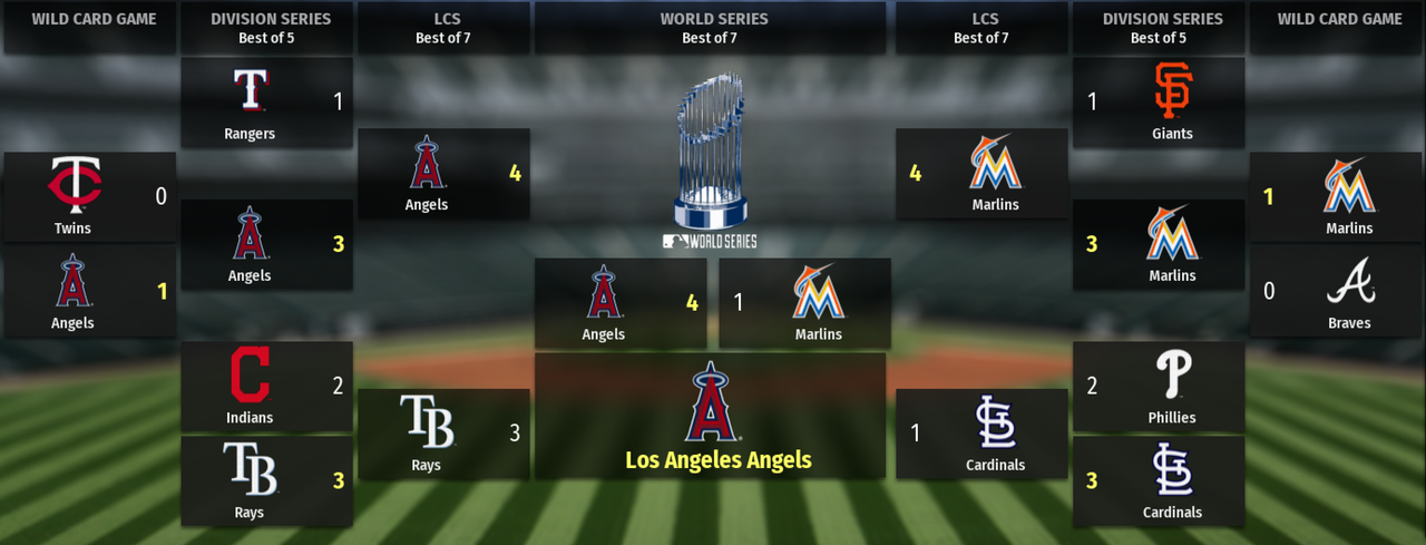 MVP: AL- Ian Edwards (LAA) NL- Miranda Cy Young: AL- Stone NL- Jon Decker (MIA) ROY: AL- Cletus Rabinovich (DET) NL- Hsin-pei Khoo (PHI) HOF: Kindel, Oviedo Regular season standings... ![]() Batting leaders... ![]() Pitching leaders... ![]() And playoffs... ![]() Okay, more waiting it is... |