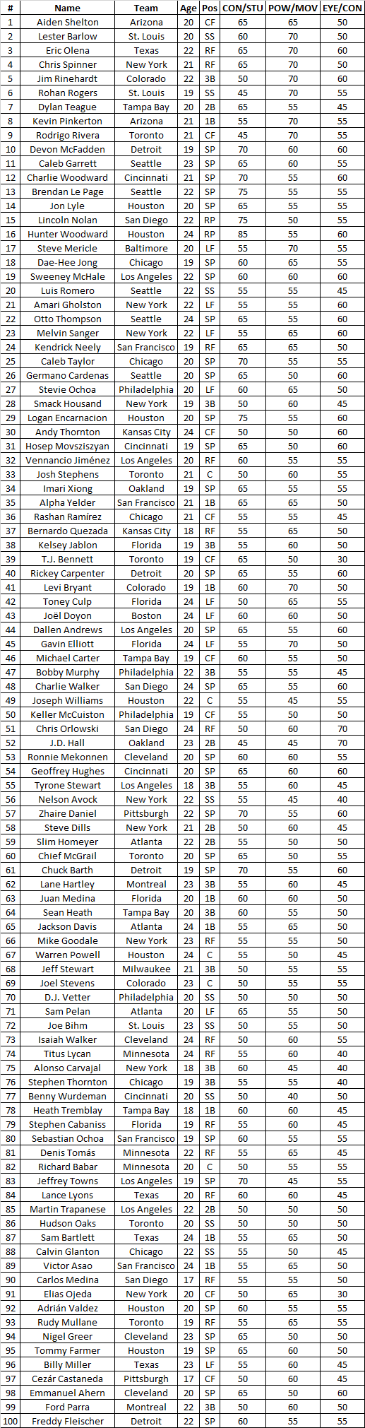 American League: SP Celio Cabedo (BOS) - 12-6, 2.15 ERA, 172.0 IP, 1.08 WHIP, 6.7 K/9, 5.5 WAR SP Benjamino Lazalde (KC) - 7-6, 1.99 ERA, 135.2 IP, 1.12 WHIP, 8.5 K/9, 3.9 WAR SP Jeff Marcum (MIN) - 10-8, 2.17 ERA, 170.0 IP, 1.17 WHIP, 4.9 K/9, 4.0 WAR (Injured) SP Shemar Myrie (TB) - 10-8, 1.59 ERA, 164.0 IP, 0.97 WHIP, 6.0 K/9, 5.3 WAR SP Gabe Parker (CHA) - 12-3, 1.61 ERA, 157.0 IP, 1.04 WHIP, 4.6 K/9, 4.2 WAR SP Luis Salgado (OAK) - 4-10, 2.26 ERA, 147.2 IP, 1.04 WHIP, 5.9 K/9, 4.1 WAR CL Jonathan Altamirano (LAA) - 2-2, 24 SV, 0.53 ERA, 51.0 IP, 0.78 WHIP, 6.4 K/9, 1.9 WAR CL Chris Becker (CHA) - 3-5, 30 SV, 1.86 ERA, 53.1 IP, 1.14 WHIP, 6.9 K/9, 2.5 WAR CL Tim Beckman (TOR) - 2-3, 25 SV, 0.70 ERA, 51.1 IP, 0.88 WHIP, 8.6 K/9, 2.5 WAR CL Phil Campbell (SEA) - 3-1, 21 SV, 0.42 ERA, 43.1 IP, 0.76 WHIP, 11.0 K/9, 2.7 WAR C Ronnie Cook (TEX) - .260/.330/.330, 288 AB, 1 HR, 1 SB, 109 wRC+, 2.6 WAR C Bobby Fendley (CHA) - .272/.308/.324, 309 AB, 1 HR, 102 wRC+, 2.2 WAR C Rory Kessler (KC) - .280/.337/.354, 243 AB, 1 HR, 123 wRC+, 2.5 WAR (Injured) 1B Tristan Hunsinger (MIN) - .315/.400/.398, 362 AB, 5 HR, 5 SB, 150 wRC+, 2.9 WAR 2B Murray Gunnell (NYY) - .299/.350/.383, 394 AB, 1 HR, 23 SB, 139 wRC+, 4.9 WAR 3B Jody Davison (BOS) - .339/.367/.378, 407 AB, 1 HR, 1 SB, 135 wRC+, 4.4 WAR 3B Tim Shriver (SEA) - .297/.331/.379, 391 AB, 1 HR, 33 SB, 124 wRC+, 2.7 WAR SS Eric Copeland (NYY) - .283/.305/.339, 322 AB, 13 SB, 103 wRC+, 3.1 WAR SS Ralondo Pantoja (BOS) - .246/.289/.342, 284 AB, 3 HR, 12 SB, 100 wRC+, 3.3 WAR LF Travis Chisholm (HOU) - .318/.352/.490, 365 AB, 1 HR, 62 SB, 163 wRC+, 3.7 WAR CF Nick Caruso (OAK) - .248/.301/.353, 351 AB, 40 SB, 113 wRC+, 2.9 WAR CF Yun-ho Chun (TEX) - .257/.315/.416, 382 AB, 1 HR, 39 SB, 128 wRC+, 4.6 WAR RF Onliber Krause (TOR) - .293/.349/.368, 389 AB, 23 SB, 127 wRC+, 3.5 WAR RF Ken Schneider (TEX) - .262/.315/.397, 393 AB, 4 HR, 43 SB, 126 wRC+, 2.3 WAR RF Micah Wolk (CHA) - .283/.335/.375, 336 AB, 1 HR, 18 SB, 130 wRC+, 2.8 WAR National League: SP J.P. Avila (PIT) - 8-8, 1.68 ERA, 160.1 IP, 1.05 WHIP, 5.9 K/9, 4.6 WAR SP Steve Cagle (SF) - 8-6, 2.55 ERA, 159.0 IP, 1.11 WHIP, 4.2 K/9, 4.0 WAR SP Kurt Cheshier (COL) - 15-3, 2.01 ERA, 165.1 IP, 1.11 WHIP, 5.4 K/9, 3.7 WAR SP Ignacio Diadoni (STL) - 13-8, 2.32 ERA, 178.2 IP, 1.04 WHIP, 3.8 K/9, 3.3 WAR SP Steve Gardiner (CIN) - 10-7, 1.32 ERA, 163.1 IP, 1.08 WHIP, 5.3 K/9, 3.6 WAR SP Mike Richter (SF) - 8-6, 2.17 ERA, 165.2 IP, 1.16 WHIP, 6.8 K/9, 4.2 WAR RP Ismael Pineda (SD) - 5-1, 0.00 ERA, 40.0 IP, 0.82 WHIP, 2.9 K/9, 0.4 WAR CL Sebastien Cavalleri (COL) - 1-3, 28 SV, 1.70 ERA, 47.2 IP, 1.05 WHIP, 7.2 K/9, 2.0 WAR CL Luis Navarro (SD) - 6-3, 26 SV, 1.48 ERA, 61.0 IP, 0.85 WHIP, 7.8 K/9, 2.5 WAR CL Smail Tortorella (STL) - 4-1, 20 SV, 1.45 ERA, 49.2 IP, 0.83 WHIP, 4.9 K/9, 1.0 WAR C Josh Fowler (SF) - .267/.357/.320, 300 AB, 1 HR, 3 SB, 118 wRC+, 2.9 WAR C Jeremy Humiston (LAD) - .313/.366/.371, 310 AB, 138 wRC+, 3.9 WAR C Zheng Xue (PHI) - .318/.358/.379, 280 AB, 136 wRC+, 2.9 WAR 1B Sean Spillman (NYM) - .299/.346/.384, 331 AB, 4 HR, 1 SB, 137 wRC+, 2.4 WAR 2B Livan Giraldo (PHI) - .289/.330/.421, 318 AB, 3 HR, 2 SB, 135 wRC+, 3.9 WAR 2B Ben Klink (COL) - .292/.348/.372, 339 AB, 1 HR, 44 SB, 129 wRC+, 3.0 WAR 3B Sherwood Conkel (LAD) - .283/.322/.347, 378 AB, 2 HR, 118 wRC+, 3.0 WAR SS Oliver Finnie (CHC) - .235/.278/.340, 315 AB, 1 HR, 11 SB, 94 wRC+, 3.5 WAR SS Kevin Kramer (ATL) - .256/.330/.360, 347 AB, 5 HR, 5 SB, 124 wRC+, 4.3 WAR LF Dan Gilmore (STL) - .321/.389/.498, 327 AB, 2 HR, 15 SB, 177 wRC+, 3.3 WAR LF Kadin Henderson (PHI) - .308/.363/.430, 393 AB, 2 HR, 27 SB, 148 wRC+, 2.8 WAR LF Steve Rojas (SF) - .270/.321/.424, 363 AB, 4 HR, 33 SB, 138 wRC+, 3.7 WAR CF Rob Mosher (SF) - .281/.345/.443, 366 AB, 1 HR, 39 SB, 152 wRC+, 2.7 WAR CF Renae Selbst (MON) - .219/.288/.316, 320 AB, 30 SB, 90 wRC+, 3.0 WAR CF Tim Winward (PHI) - .311/.349/.435, 354 AB, 1 HR, 18 SB, 147 wRC+, 3.7 WAR (Injured) |