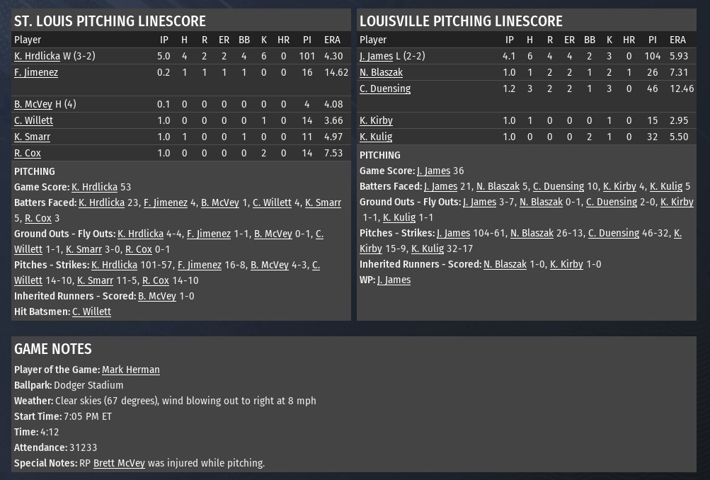 Nolan Gorman led off the top of the ninth inning with a walk-off home run off Louisville reliever Nate Blaszak as St. Louis completed a three-game sweep of the Sluggers at Busch Stadium (2006). Gorman's first homer since signing as a free agent with the River Walkers on April 20 came on a 2-1 pitch a traveled 393 feet over the wall in right field. Louisville got seven shutout innings from Josh McDonald and owned a 3-0 lead going into the bottom of the eighth. All three of the Sluggers runs came in the top of the second inning off St. Louis starter Miguel Cisneros With two singles, an error and a walk, Louisville put its first four batters on base. The walk to McDonald scored the game's first run. Isaac Rodriguez drove in Joe Connel with a fielder's choice. Ryan West made it 3-0 when he scored on a Chris Zoltan fly ball to center. With almost no one available in their bullpen because of injuries and fatigue, Louisville brought McDonald back for the eighth inning. It didn't go well. After getting Gorman to fly out to lead off the inning, Zach Wenman and R.J. Gomez both followed with singles. Pinch-hitter Jose Ramon then tied it was a long home run to right center. It traveled 426 feet. But the Walkers were not done as they went on to take the lead. Ryan Wibbenmeyer followed the Ramon homer with a single. Wibbenmeyer, however, was thrown out by Sluggers catcher Joe Connel trying to steal second. Still, Mark Herman followed with a double. He scored when Manuel Coke also doubled to make it 4-3. But Louisville did tie it in the top of the ninth against reliever Leo Hermansillo. Zachary Landis singled with one out. Joe Bien pinch-ran for Landis. A Ryan West single moved Bien to second. After a strikeout of Brice Mills, Issac Rodriguez singled to score Bien and tie it. Brett McVey replaced Hermosillio. He gave up a single to Chris Zoltan, but Herman threw out West at the plate. Cisneros had just the one bad inning, as he went six altogether allowing the three runs on five hits. He struck out four and walked two. Chris Willett pitched two innings of scoreless relief. Hermosillo got the first two outs of the ninth. McVey (2-1) allowed a single to the only batter he faced, got bailed out by Herman's strong throw to the plate. |