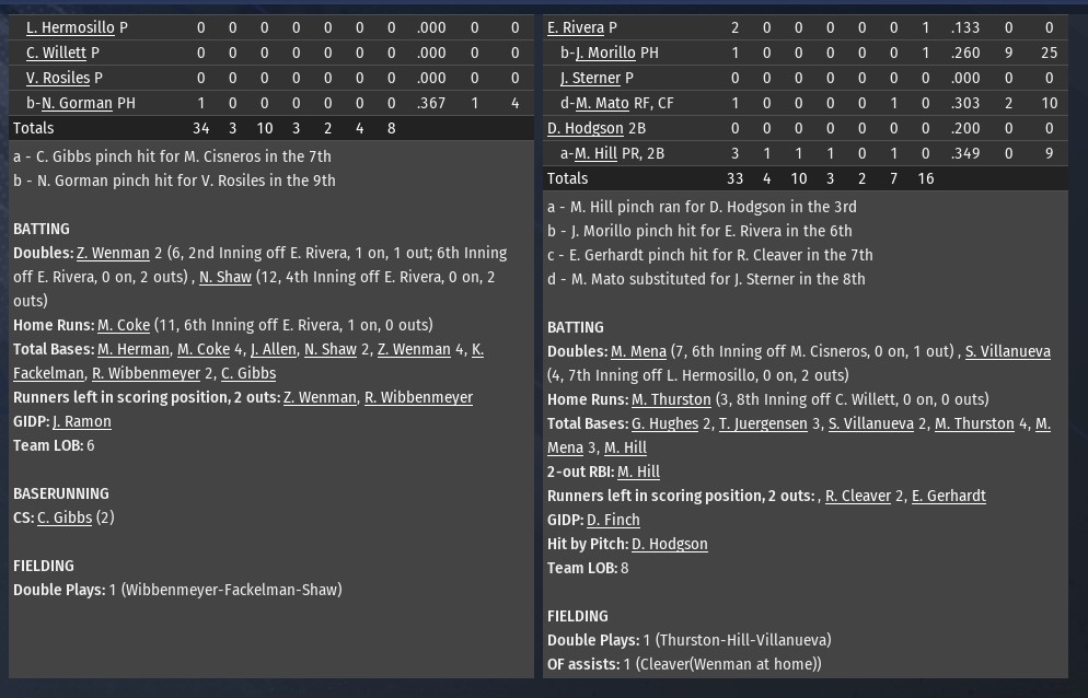 Cedar Rapids banged out four straight singles to begin the bottom of the 10t inning to drive in the winning run of a 4-3 victory over St. Louis at Connie Mack Stadium (1960). The victory was the second in a row for the Grapplers to complete the three-game series Just called up from AAA, Victor Rosiles took the mound for the River Walkers to begin the 10th. He got rocked. Matt Thurston led off with a single and he moved to second on a single by pinch-hitter Don Hodgson. Lamar Black then loaded the bases with an infield single as shortstop Kerry Fackelman could not get the ball out of his glove. Mark Hill then won it lining a 2-0 pitch into left-center. An inning earlier, Cedar Rapids had tied it with a run off St. Louis closer Craig Fritzler. Fritzler walked Miguel Mato to open the inning and then gave up a single to Dane Finch as Mato took third. Maro scored on an Eric Gerhardt fly ball to left. It marked Fritzler's fifth blown save of the season. Fritzler had four blown saves the entire 2038 season. The Walkers had taken a 3-2 lead on a Jose Ramon homer off Elijah Louis to open the bottom of the eighth. Grapplers starting pitcher Joel Glenn lasted just 4.2 innings, allowing two runs on five hits. He struck out one and didn't walk a batter. Dave Vacarri finished the fifth and also worked a scoreless sixth. After that, it was one inning apiece from four relievers, Justin Sterner, Elijah Louis, Steve Murphy and Hector Miro to close out the game. Miro (4-2) came out of it with the win. |
