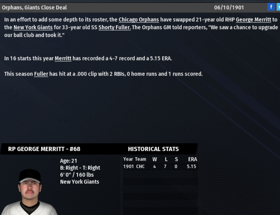 The first AI trade happened, with the Chicago Orphans sending pitcher George Merritt to the New York Giants for shortstop Shorty Fuller. While there is clearly nothing special about the players involved in the trade, it is nice to see the AI doing its job.