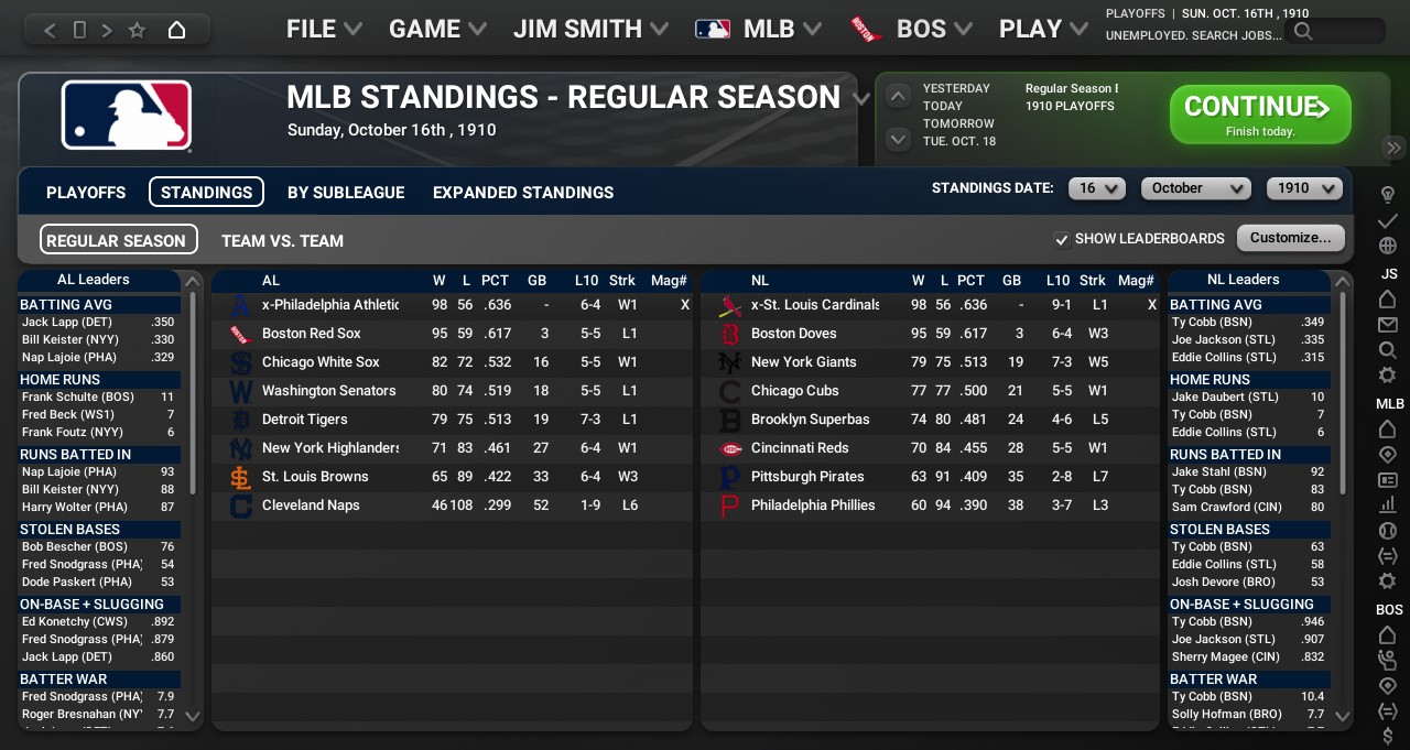 -C Jack Lapp of the Detroit Tigers wins the AL Best Batter award with 1 home run, 51 RBIs, and 56 runs scored. -CF Ty Cobb of the Boston Doves wins the NL Best Batter award with 7 home runs, 83 RBIs, and 91 runs scored. -SP Russ Ford of the Boston Red Sox wins the AL Triple Crown with a 32-7 record, a 1.71 ERA, and 224 strikeouts. Awards for September: 1B Fred Snodgrass of the Philadelphia Athletics wins the AL Batter of the Month Award with 1 home run, 10 RBIs, and 19 runs scored. CF Ty Cobb of the Boston Doves wins the NL Batter of the Month Award with 0 home runs, 16 RBIs, and 10 runs scored. SP Ray Collins of the Boston Red Sox wins the AL Pitcher of the Month Award with a 6-1 record and a 2.52 ERA. SP Hippo Vaughn of the Chicago Cubs wins the NL Pitcher of the Month Award with a 6-0 record and a 1.26 ERA. SP King Cole of the Cleveland Naps wins the AL Rookie of the Month Award with a 4-2 record and a 2.08 ERA. SP Ralph Works of the Chicago Cubs wins the NL Rookie of the Month Award with a 5-0 record and a 1.87 ERA. After a back-and-forth, the World Series matchup for 1910 has been determined: it's the Philadelphia Athletics (98-56) vs. the St. Louis Cardinals (98-56) in their first appearance in the World Series. Last edited by Lord Byron; 02-04-2024 at 10:16 PM. |