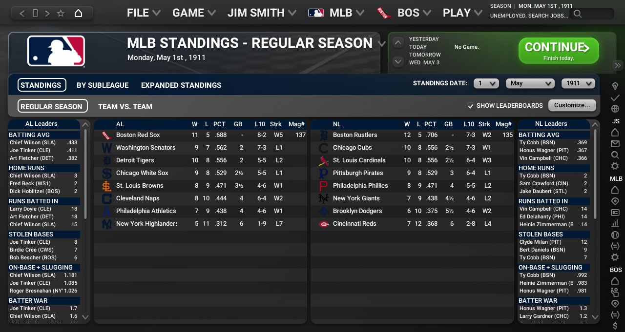 3B Frank Baker of the Washington Senators wins the AL Batter of the Month Award with 4 home runs, 24 RBIs, and 15 runs scored. CF Ty Cobb of the Boston Rustlers wins the NL Batter of the Month Award with 4 home runs, 25 RBIs, and 25 runs scored. SP Harry Krause of the Chicago White Sox wins the AL Pitcher of the Month Award with a 5-1 record and a 1.29 ERA. SP Ed Walsh of the Boston Rustlers wins the NL Pitcher of the Month Award with a 5-2 record and a 1.49 ERA. SP Grover Cleveland Alexander of the Cleveland Naps wins the AL Rookie of the Month Award with a 6-1 record and a 2.74 ERA. SP Lefty Tyler of the Boston Rustlers wins the NL Rookie of the Month Award with a 4-3 record and a 3.33 ERA. In the AL, the Detroit Tigers are in first place while, in the NL, the Boston Rustlers continue to hold on to first place with a 2 and a half games lead. |