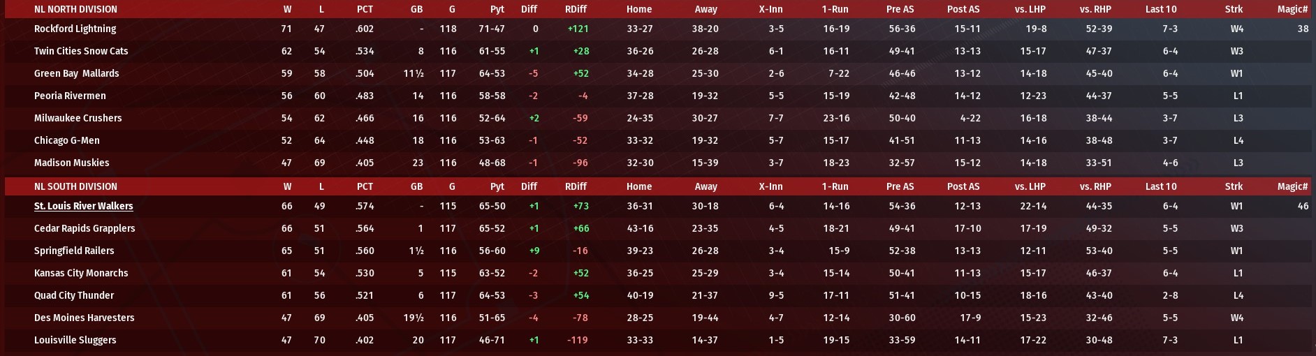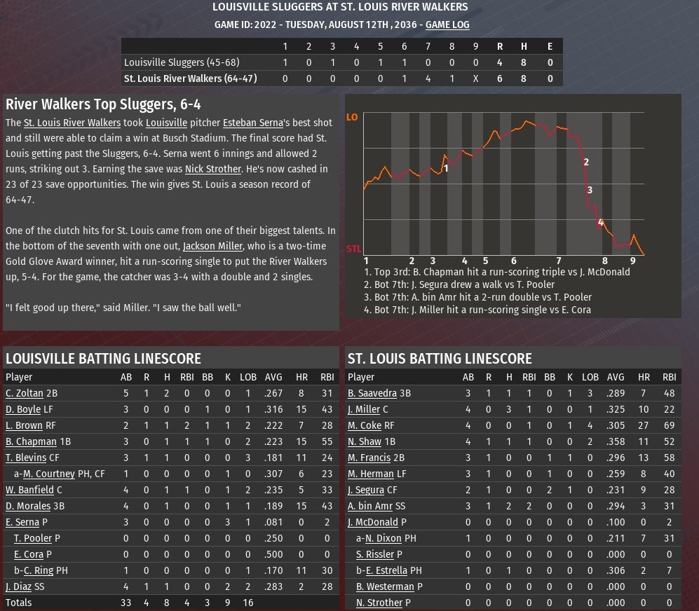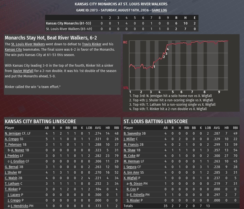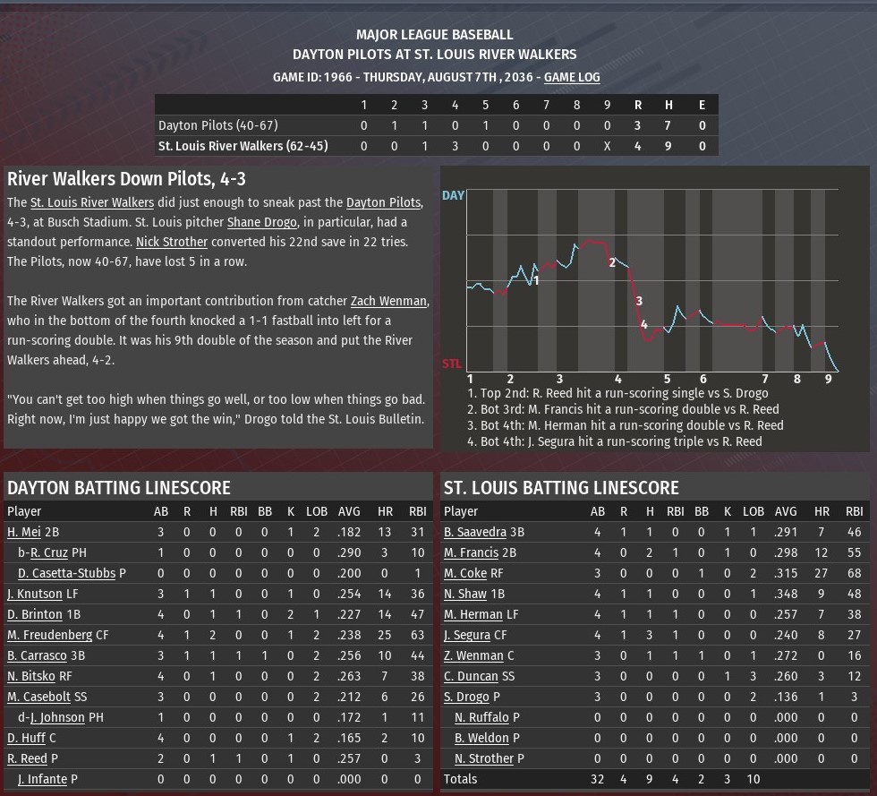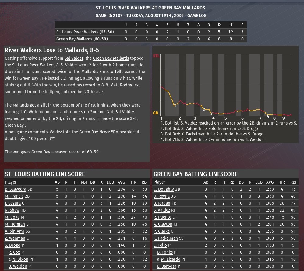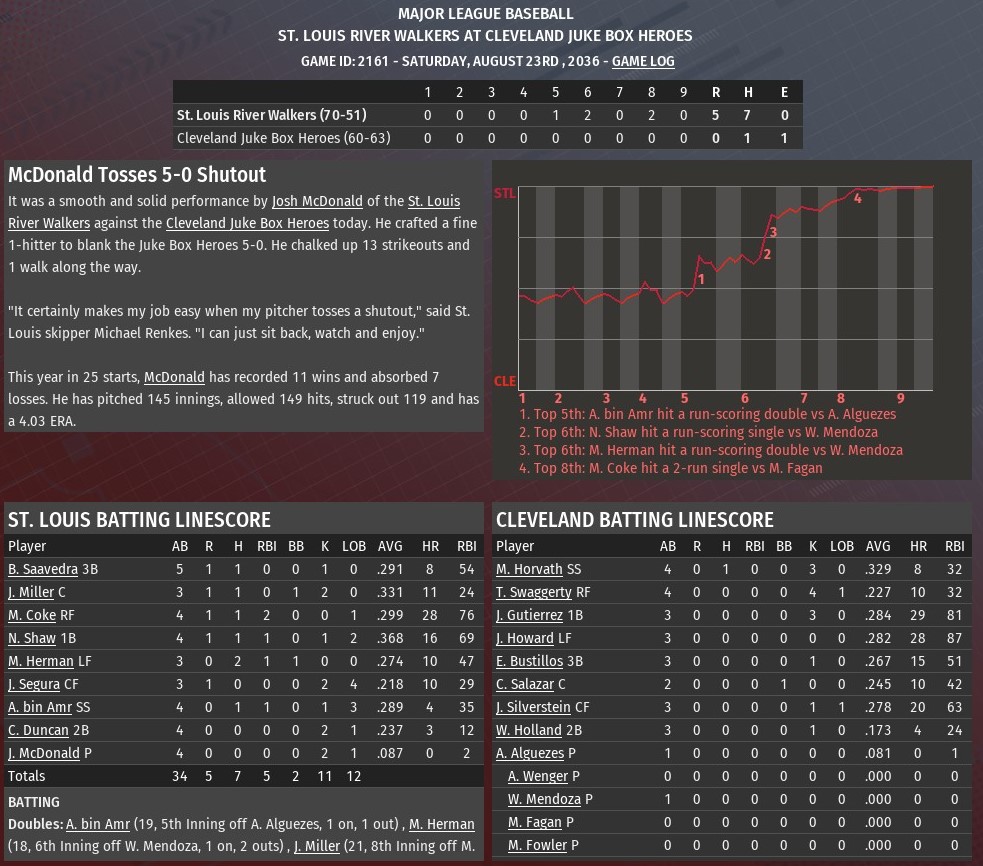 St. Louis jumped out to a 3-0 lead after an inning and a half, and held on to defeat Cleveland 7-4 at Cleveland Stadium (1980). Catcher Jackson Miller had a nice day at the plate for the River Walkers going 3 for 5 with a homer, three runs scored and an RBI. Miller scored the game's first run in the top of the first, when he doubled with one out off Juke Box Heroes starting pitcher Bill Van Gieson and scored when Nick Shaw hit his 16th homer of the season. Miller hit a solo homer in the second off Van Gieson to make it 3-0. It's lead sitting at 4-3, the River Walkers expanded that edge with three runs in the top of the eighth against the Cleveland bullpen. Heroes reliever Leo Hermosillo allowed the first three batters to reach base, including an RBI double by Nathaniel Dixon. Pinch-hitter Eddie Estrella then drove in a run with a ground out. Bob Saaedra plated the game's final run with a single. St. Louis starting pitcher Xavier Wigfall (9-9) worked 6.2 innings, allowing three runs on six hits. He struck out five and walked three. Reliever Greg Sones replaced Wigfall, and failed to retire any of the three batters he faced -- allowing two singles and a walk -- as the Heroes scored once to pull to within 4-3. Scott Rissler got Edgar Bustillos to fly out with the bases loaded to end the seventh. Ron Cox worked a scoreless eighth, but issues three walks in the ninth to load the bases with two outs. Nick Strother took over, and allowed a single to Bustillos to make it 7-4. However, Strother got Joey Kiernan to fly out to end it. The save was Strother's 24th of the season. |