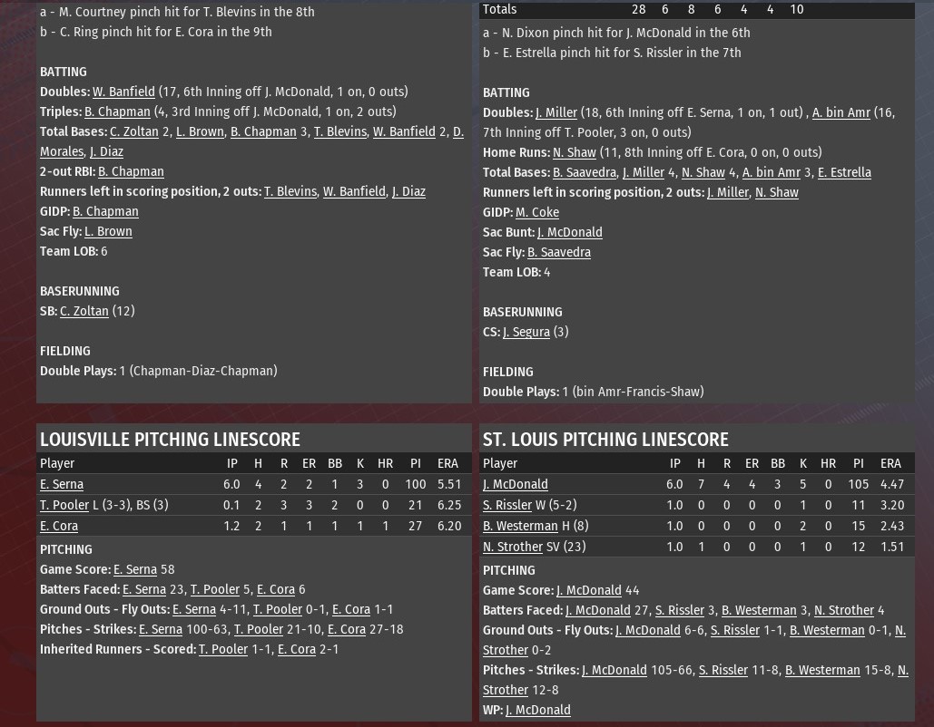 Shane Drogo pitched a two-hit shutout to earn his 14th win of the season, as St. Louis downed Louisville 4-0 at Busch Stadium (2006). A lead-off triple to David Morales in the top of the second inning and a two-out single by Bobby Chapman in the fourth were the only hits allowed by Drogo (14-4), whose 14 wins leads the rest of the MBL by two. The left-hander struck out nine and didn't issue a walk. Led by 5.1 shutout innings by starter Jose Lopez, the Sluggers held the River Walkers scoreless until the bottom of the seventh. That's when they busted loose for all four of their runs. Rookie Mark Herman did the bulk of the damage with his ninth homer of the season, a three-run shot of Danny Wright which opened the scoring. Later in the inning, Nathaniel Dixon tripled and scored on a two-out single by Bob Saavedra. |