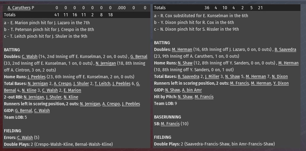 Abdul-Nasser bin Amr led off the top of the 15th inning with a home run off Cleveland relief pitcher Josh Paul, and St. Louis would go on to score four runs in the inning on its way to a 13-9 win at Cleveland Stadium (1980). Bin-Amr's fourth homer of the season only sparked the late-game offense for the River Walkers. Zach Wenman, Eddie Estrella and Bob Saavedra followed with back-to-back singles to load the bases. Nick Shaw later drove in three runs with a double, making it 13-9. Juke Box Heroes starting pitcher Bob Granillo hit a three-run homer off St. Louis starter Kevin Hrdlicka in the bottom of the second to put his team up 3-0. The River Walkers exploded for seven runs in the top of the fifth. Manuel Coke and Shaw had the big hits. Coke had a two-run double. Shaw plated a pair with a single. Down 7-4, the Heroes later took the lead following a five-run bottom of the sixth. Javy Guterrez did most of the work with a grand slam off Walkers relief pitcher Nick Ruffalo. The Walkers tied it in the top of the ninth. Marcos Francis, Manuel Coke and Nick Shaw opened the inning with three consecutive singles off Heroes relief pitcher Willie Mendoza. After Jose Segura struck out with the bases loaded, Mike Fagan took over for Cleveland. Nathaniel Dixon hit into a fielder's choice, with Francis scoring to make it 9-8. Fagan then made an errant pick-of throw to first, allowing Coke to score to tie the game. St. Louis used seven pitchers to earn the win. Rookie starter Kevin Hrdlicka lasted five innings, allowing four runs on six hits. He walked five and struck out seven. Scott Rissler failed to record an out while pitching in the sixth. He was charged with three of the Heroes runs. Nick Ruffalo got all three of the outs in the sixth, but also was charged with giving up two runs. After that it was, Bobby Westerman, Nick Strother, Armondo Cintron for two scoreless innings. Brennan Weldon (5-1) pitched three innings, also not allowing a run, to earn his fifth win of the season. |