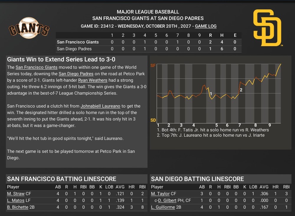 MLB news: Oct. 20-- NL Championship Series Game 3 - Giants 2, Padres 1, San Francisco leads 3-0