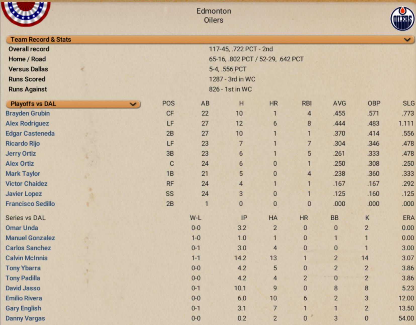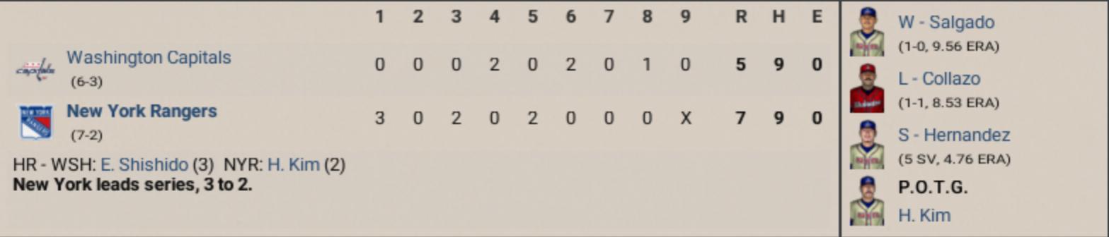 Lance Sellers, Capitals 1st baseman, at the age of 39 this year had announced his plans for retirement earlier this season.. A good fielder with some pop in his bat, but not really known for his offense, appears to have had one final hurrah, winning Game 4 of the East Conference Semifinals vs. the Rangers with a walk-off 2-run clout in the bottom of the ninth, capping off Washington's rally to tie the series at 2-2. Sellers has bounced around the league with a few different teams over his career. In fact, the Caps are his 4th different team in the past 4 years. This is the kind of story that makes OOTP great.