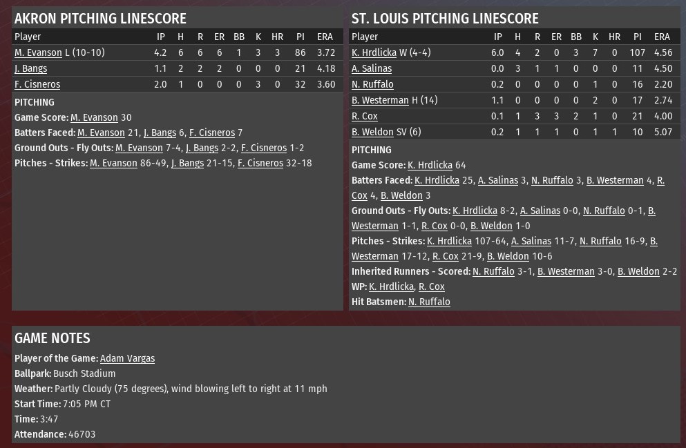 Trailing 2-1, St. Louis exploded for five runs in the top of the fifth inning and added two more in the sixth, and the River Walkers needed every one of them as they held on for an 8-7 win over Akron at Busch Stadium (2006). The win gave St. Louis' wins in two of the final three games of the series between division leaders. The Walkers' five-run fifth featured a pair of home runs. Nathaniel Dixon led off the inning with his eighth homer of the season. Manuel Coke capped the outburst with his 33rd of the season, a two-run shot. In between, Bob Saavadera drove in a pair of runs with a double. Flying Feet starting pitcher Mike Evanson was on the mound for all the damage. In the next inning, Eddie Estrella led off with a single off reliever Jeremy Bangs. The next batter, Dixon, Estrella home with a triple. Dixon then scored on an Abdul-Nasser bin Amr ground out. The Feet started their comeback with a run in the seventh inning. They then really made it interesting in the ninth. Three of Akron's first four hitters reached base against reliever Ron Cox, a pair of walks sandwiched around a Bill Savage double. A wild pitch by Cox allowed the inning's first run to score. With runners at the corners, Brennan Weldon took the mound and proceeded to give up a three-run homer to Adam Vargas, making it 8-7. Weldon, however, settled down and got Victor Romero to ground out and struck out John Polk to end it. Walkers rookie starter Kevin Hrdlicka (4-4) went six innings, allowing two runs on four hits. He struck out seven and walked three. Rookie reliever Alex Salinas took the mound to start the seventh, and allowed all three batters he faced to reach base. Nick Ruffalo took over and got the first two outs of the seventh. Bobby Westerman wrapped up the seventh and kept the score 8-3. Cox was made in his third of an inning in the ninth. Weldon gave up the Vargas' homer, but still earned his sixth save. |