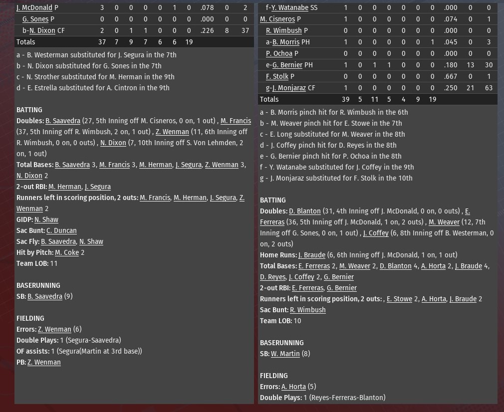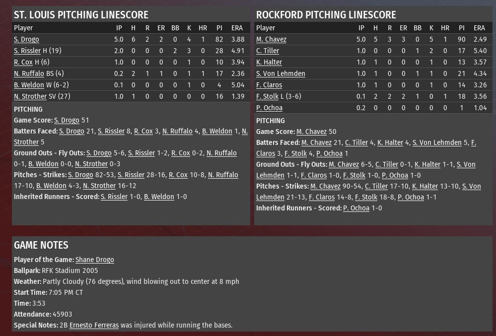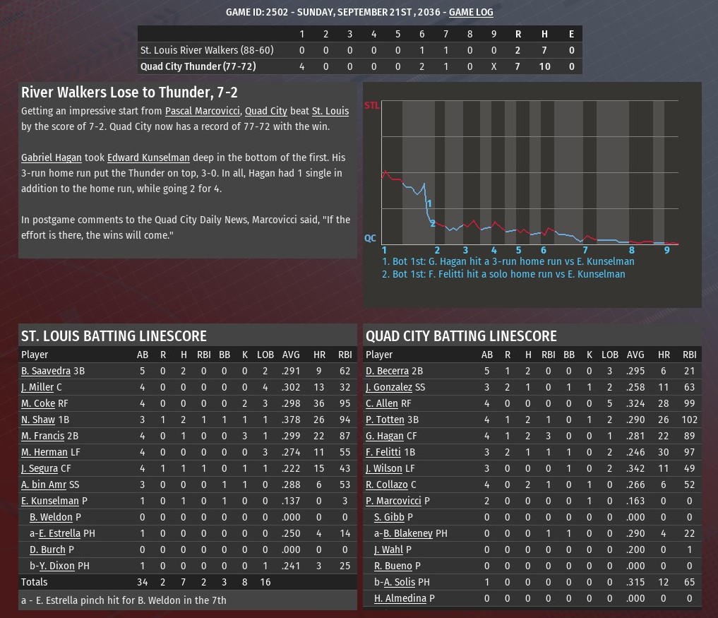 A red-hot month of September for the St. Louis River Walkers as they jumped out to a 4-0 lead after 5.5 innings and went on to defeat Cincinnati 7-3 at Riverfront Stadium (1984). The loss was the sixth in a row for St. Louis and moved Walkers to 10-1 since the start of the month. Jose Segura connected for an RBI triple off River Sharks starting pitcher Chris Novotny and later scored on a Abdul-Nasser bin Amr fly ball to highlight a two-run top of the second inning. In the sixth, Manuel Coke and Marcos Francis hit back-to-back homers off Novotny to open the inning and push that advantage to 4-0. Cincinnati did pull to within 4-3, with two runs off Walkers starter Xavier Wigfall in the bottom of the sixth. A wild pitch scored one run while Tom Aloisio drove in the other with a two-out single off Nick Ruffalo. Jonathan Hodges connected on for an RBI single off Bobby Westerman with one out in the seventh. St. Louis added two insurance runs in the top of the ninth. Segura scored for the second time. This time he led off with a double off Carlos Aguirre. A bin Amr single moved Segura to third, and a third consecutive hit, this one a single from Zach Wenman, sent him across the plate. Later, bin Amr scored on a two-out single by Coke off Braxton Ashcraft. Wigfall (12-9) worked five shutout innnings, but didn't record an out in the sixth. He still earned the win, allowing two runs on five hits. He struck out five and walked three. Ruffalo got all three outs in the sixth inning, and the first one in the seventh. After that, it was Bobby Westerman and Greg Sones recording three outs apiece. Scott Rissler stepped in to record the final two outs of the game. |