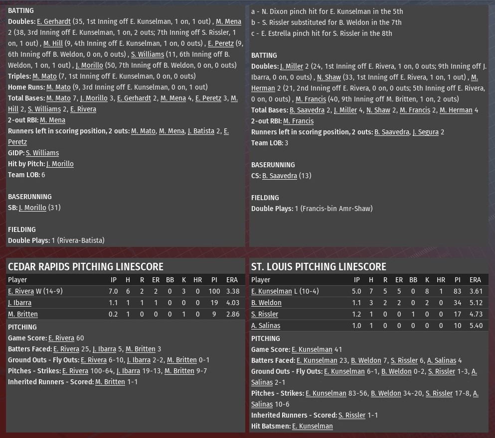 Down 2-1, Cedar Rapids scored the game's next six runs and went on to defeat St. Louis 7-3 at Busch Stadium (2006). The Grapplers gained command by scoring twice in both the third and four innings off River Walkers starting pitcher Edward Kunselman. A Miguel Mato homer accounted for the first run in the top of the third. Miguel Mena drove in the other run with a double, scoring Jose Morillo, who had been hit by a pitch. Eric Peretz led off the fourth for the Grapplers with a single. He scored when the next batter, Mark Hill, doubled. Pitcher Edwin Rivera scored Hill with a single. Steven Williams drove in Peretz, who had led off the inning with a double, with a double of his own off Brennan Weldon in the sixth. Morrillo led off the seventh with a double off Weldon. He scored on a Mena double off Scott Rissler to make it 7-2. Rivera (14-9) earned his 14th win of the season by allowing two runs on six hits over seven innings. He struck out three and didn't walk a batter. Jordyn Ibarra worked a scoreless eighth and got the first out of the ninth before getting into trouble following a double by Jackson Miler. Miguel Britten got the final two outs, he also allowed an RBI double to Marcos Francis, to seal the win. |