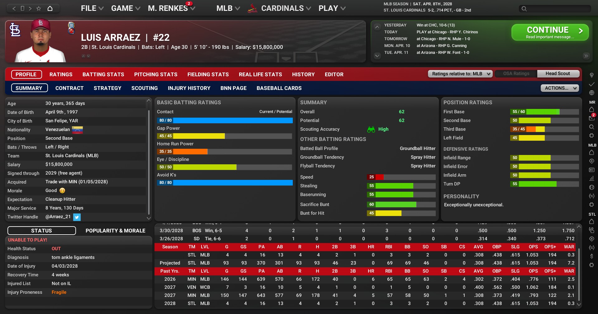 Arraez is expected to miss up to four weeks. Acquired in a trade with the Twins in the offseason, Arraez, 30, played in four games with the Cardinals before being injured in a 10-3 win over Washington on April 3. In those games, he hit .308 with three RBIs. Getting called from AAA Memphis is OF/1B Jacob Berry. Berry, who spent the entire 2027 season with the Cardinals, started the 2028 season at AAA after a poor spring training. At AAA Memphis, Berry has hit .321 with three homers and five RBIs in seven games. Last season with the Cardinals, Berry played in 138 games/135 starts during which he hit .238 with 35 home runs and 77 RBIs. Last edited by rink23; 08-14-2023 at 04:04 AM. |
