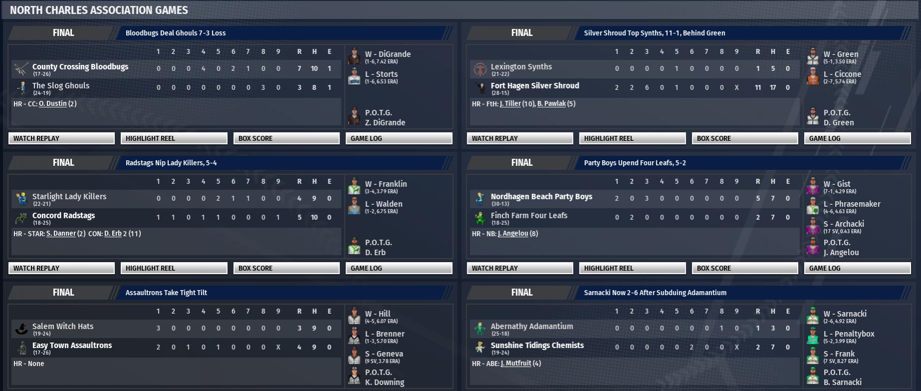 Today in the CBO News and Notes - Reports from around the Commonwealth by Nat Wright-Kawolski 30 May 2299 - Marble Sharp in 6-0 Shutout Tristan Marble of the Lexington Synths spun his magic on the County Crossing Bloodbugs today. He blanked them 6-0 on 3 hits, registering 7 strikeouts and 1 walk. "The bottom line was I just kept the ball down," Marble said. "My breaking stuff was down. Everything was down." Talking to reporters in the postgame interview, Lexington skipper Sprole Races said the team "got solid pitching, good defense and took great team at-bats in a lot of different situations." "Tristan pitched really well but this was a solid performance by everyone," he said. In 11 starts this season Marble has rung up a 3-4 record and a 3.79 ERA. 30 May 2299 - Koester Socks 2 Home Runs in 6-3 Concord Win The Concord Radstags downed the Nordhagen Beach Party Boys, 6-3. The hitting star was shortstop Sean Koester. Koester was 3 for 5 with 2 home runs and a double. He drove in 4 runs and scored twice for the Radstags. Concord goes to 17-24, Nordhagen Beach to 28-13. Koester contributed a big hit, a 3-run home run, for Concord in the top of the second. With his team trailing 1-0, Koester took a slider from Tommy Beach and stroked the home run to right. His 5th home run of the season allowed the Radstags to leap in front, 3-1. Koester called the triumph "a good team win." Tommy Beach (5-5) suffered the loss despite giving up only one earned run. The problem was Beach gave up a total of four runs thanks to errors by Dustin Mart and Mike Swift. 30 May 2299 - Brahmin Leads Witch Hats to Win The performance of Ian Brahmin proved critical in helping Salem beat Starlight, 5-2. The Witch Hats third baseman went 3 for 3 with a home run and 2 singles, while adding 4 RBI and scoring once. Dan Beantown, summoned from the bullpen, notched his 6th save. Salem is third in the North Charles Association Brotherhood League with a record of 18-23. Brahmin had a game-changing home run in the bottom of the seventh. On a 1-1 fastball from City Moore, he banged a 3-run home run to right, giving the Witch Hats a 5-2 lead. It was the 4th home run of the year for Brahmin. "We'll enjoy this win," said Brahmin. "But there's more we hope to accomplish." 30 May 2299 - Assaultrons Collect 4-3 Win Over Silver Shroud in 12 Easy Town Assaultrons starter Smoker Caliman was in a groove as he led his team to a win over the Fort Hagen Silver Shroud, 4-3. Fort Hagen has now lost 5 straight. The Assaultrons relied on right fielder Dan Squirrel for the game-winning hit. And, in the bottom of the 12th, he delivered, hitting a run-scoring single to seal the deal. Caliman called the extra-inning win a "confidence builder." 30 May 2299 - Swatters Top Mirelurks, 4-0, Behind Fusion The Diamond City Swatters picked up a win at The Great Green Jewel, knocking off the Warwick Mirelurks, 4-0. Starting pitcher Tim Fusion played a key role in the triumph. The win gives Diamond City a season record of 30-11. Fusion scattered 3 hits over 7.1 innings for the Swatters. With the win, Fusion moves to 7-2 on the year with 72 strikeouts. "I tried to mix it up, keep them off balance," said Fusion.