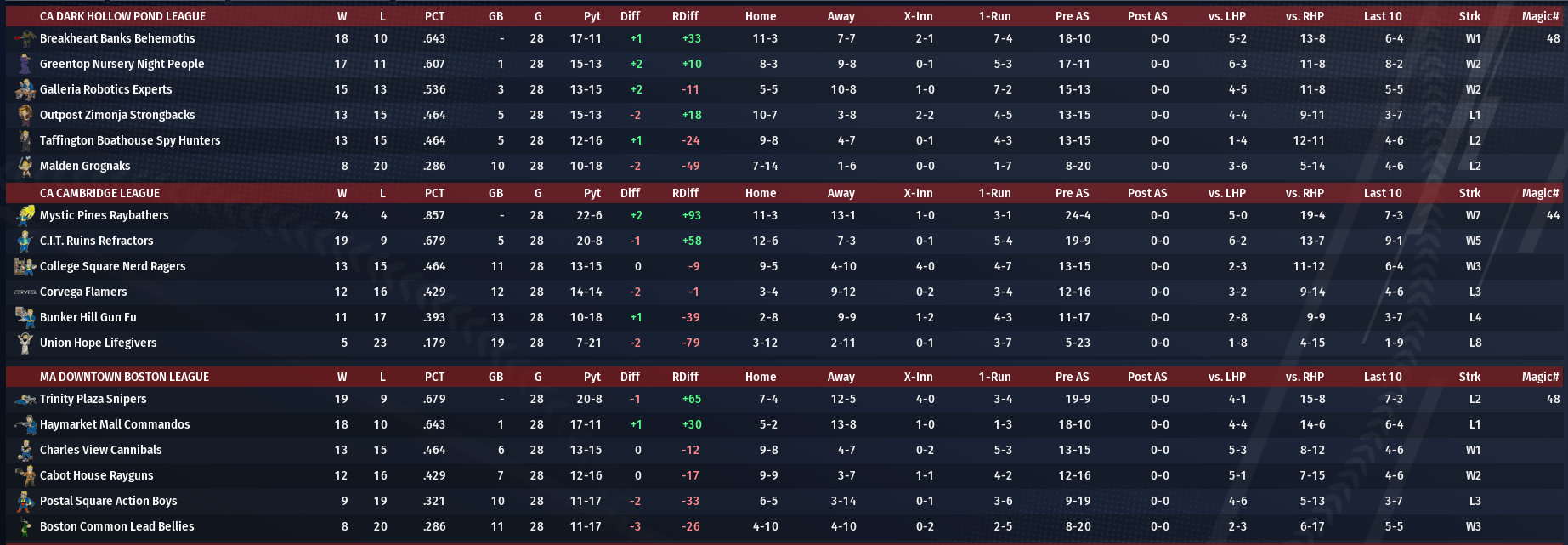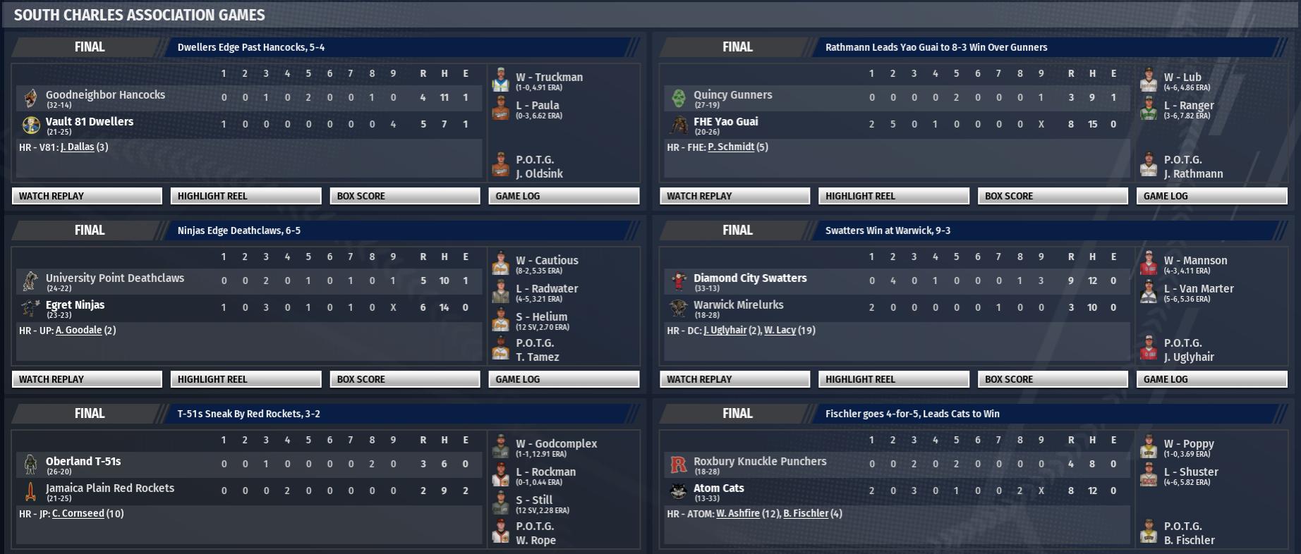 Today in the CBO News and Notes - Reports from around the Commonwealth by Nat Wright-Kawolski 4 June 2299 - More Injury Problems For Nordhagen Beach's Julian Shed Fans hoping to see Nordhagen Beach Party Boys starting pitcher Julian Shed back in action will have to be a little more patient since Shed is expected to miss another 4 days of action. The player's rehabilitation has not gone as well as expected. Shed is recovering from a strained back muscle. To date this season Shed is 3-4 with 9 starts and an ERA of 4.24 with 34 strikeouts in 46.2 innings. 4 June 2299 - BMU: Injury Derails Season for Nomad After several days of waiting for test results, bad news was delivered to Supe Nomad today. The Haymarket Mall reliever will be out the rest of the year due to a fractured elbow he suffered on 06/01/2299. Nomad has pitched 16.1 innings and molded a 4.96 ERA with no saves. He has surrendered 17 hits while registering 8 strikeouts on his way to a 0-1 record for the Commandos this year. 4 June 2299 - Iddings Shines, Shuts Out University Point, 5-0 The University Point Deathclaws had no answer today for Goodneighbor Hancocks pitcher Bruce Iddings. They failed to score a single run against him, losing 5-0. University Point managed only 5 hits off Iddings, who had 7 strikeouts. The extraordinarily popular Iddings got a standing ovation from the hometown crowd as he left the field, the applause continuing until he returned from the dugout to tip his cap to the crowd. "Hancocks fans are the best fans, in my opinion," he said. "It's a great feeling to throw a shutout under any circumstances but to do it with the crowd behind you like that is just incredible." To this point in the season Iddings has 7 wins and 4 losses and a 3.24 ERA. Bryan Assman led the Hancocks in hitting, going 3 for 4 with a home run (10), a run, and four RBI. His homer was a three-run shot off Quentin Malone (4-5). 4 June 2299 - Rome, Yao Guai Get 7-0 Win The FHE Yao Guai picked up a win at BosCom Circle, knocking off the Oberland T-51s, 7-0. Starting pitcher Bow Rome played a key role in the triumph. The 'W' lifts FHE's record to 19-26. Rome was in the zone all game. He frustrated Oberland hitters while giving the Yao Guai 8.1 innings of quality work. Rome threw 117 pitches, allowing 4 hits and getting 7 punchouts. "I found a nice groove out there," said Rome. 4 June 2299 - Cartrette Now 7-2 After Subduing Synths The Fort Hagen Silver Shroud topped the Lexington Synths, 5-1, in North Charles Association action at Hubris Comics Park. The standout performance belonged to Fort Hagen pitcher and Boston, Massachusetts, native Mike Cartrette. The triumph puts Fort Hagen at 29-16 for the season. The Synths had little chance against Cartrette, who overpowered Lexington hitters and struck out 10. "Our guys are never satisfied," said Fort Hagen manager Mark Andersen. Ben Pawlak powered the Shroud offense, going 3 for 4 with a double, two runs, and an RBI. Jim Tiller hit his 11th home run, a two-run shot. 4 June 2299 - Beach Lays Hammer Down in 9-2 Win Nordhagen Beach Party Boys starter Tommy Beach was on his game, helping his team beat the Finch Farm Four Leafs, 9-2. The losing streak for Finch Farm has now reached 4 games after being swept by the #1 Party Boys. Beach went the distance for Nordhagen Beach, allowing 2 runs on 6 hits, while striking out 10. "I like our moxie," said Party Boys manager Craig Robinson. Ryan Combs and Jon Hitman each had three hits for Nordhagen Beach. Combs had two doubles and Hitman had one. Dustin Mart hit his 10th home run of the season to lead the team. 4 June 2299 - Swatters Top Dwellers, 5-1, Behind Fusion The Diamond City Swatters racked up a win at CURIE Inc. Field, bumping off the Vault 81 Dwellers, 5-1. Tim Fusion, who started for Diamond City, pitched effectively for his team. With the win, Diamond City upped its record to 32-13. Fusion's performance can only be described as masterful. He notched 9 strikeouts in 8 innings while allowing 5 hits. Fusion, who is tied for 3rd in the SCA in strikeouts with 81, goes to 8-2 on the year with 81 strikeouts. "We'll savor this win," Fusion told the Diamond City News, "then get ready for the next game." Rookie Oren Gep was 2 for 3 with a home run, two runs, and three RBI. Wally Warwick was 3 for 5 with a double and two runs.