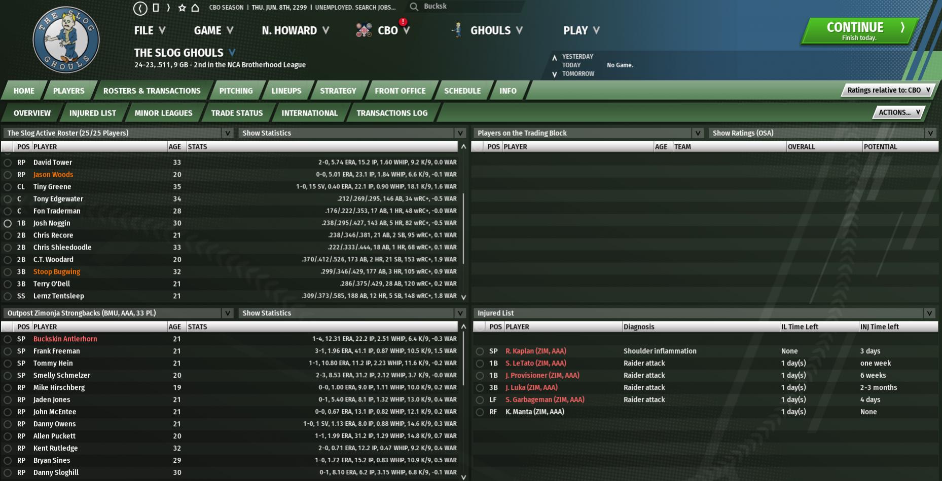 Today in the CBO News and Notes - Reports from around the Commonwealth by Nat Wright-Kawolski 5 June 2299 - Nordhagen Beach-University Point Make Major Trade It's the major deal that has everyone talking. The Nordhagen Beach Party Boys and University Point Deathclaws have reached an agreement. The Party Boys will swap 22-year-old RF Tomas Jones and a 5th round draft pick for 33-year-old RHP Tom Mannequin, 19-year-old RHP David Kidd, 20-year-old minor league CF Ralph DeYoe, 19-year-old minor league LHP Chris Essary and a 2nd round draft pick. "It's a huge shakeup," noted one reporter. "You don't see deals like this every day. A lot had to go right for this to happen." Currently Jones is batting .270 with 17 hits and 1 home run. He has knocked in 9 runs and scored 6 times. After suffering an injury, Jones was replaced with Jonathan Angelou who has exploded to a .341 average with 8 home runs and 32 RBI. "I know it's a shock to everybody," Party Boys general manager Brendan Kneecapped said. "We will miss Tomas tremendously, but we want to win a championship, and we felt getting some pitching depth in Mannequin and Kidd and an outfield prospect was the best move for us. This season Mannequin has been credited with 5 saves. In 18 relief appearances and 20 innings he has a 2-1 won-lost mark, a 1.35 ERA and 16 strikeouts. Kidd has pitched in 11 games, registering a 1-0 mark with a 6.86 ERA in 19.2 innings. Nordhagen Beach will send relievers Dave Barker and Drama Miller to Greentop Nursery to make room for their new relievers. 5 June 2299 - Koester Takes This Week's Trophy So far in his young career, Sean Koester has kept a low profile, but after his performance at the plate last week, he attracted the notice of the rest of the North Charles Association in a big way as he was named the Player of the Week today for his efforts. The 22-year-old Concord Radstags shortstop hit at a torrid .480 clip as he collected 12 hits in 25 at-bats, 2 home runs, 7 RBIs and 7 runs scored. This season Koester has banged out 66 hits in 205 at-bats for a .322 average with 5 home runs. He is getting on base at a .349 pace and his totals also include 19 RBIs and 38 runs scored. 5 June 2299 - Erickson Selected Player of the Week Aaron Erickson has the tools to stick in this league for many years. The 19-year-old shortstop of the Jamaica Plain Red Rockets had a hot bat in the South Charles Association over the past seven days and won the Player of the Week honors. Erickson batted .450 with 9 hits in 20 at-bats, 3 home runs and 8 RBIs. This season Erickson is batting .278 with 6 home runs. He has scored 14 runs and driven in 20. 5 June 2299 - BNN Stats: Reliever Split Stats Leaders Today we look at the top 5 relievers leading the Commonwealth Baseball Organization in strikeouts per 9 innings on the road. Tiny Greene, SLOG, 16.8 Aaron Still, OBE, 16.5 Josh Samm, DC, 14.0 Old Buck Buchanan, CC, 13.2 Curtis Thriceshot, FtH, 13.1