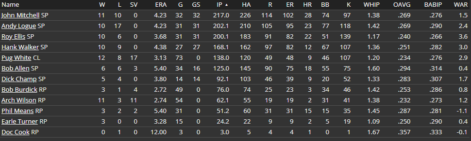 Seasonal Record: 67-59 (5th, 11 GB) Stars of the Week Gene Case : 27 AB, 8 H, 2 HR, 6 RBI, .296 AVG, 1.036 OPS Jim Barton : 23 AB, 7 H, 1 HR, 4 RBI, .304 AVG, .913 OPS Bobby Martinez : 24 AB, 8 H, 0 HR, 3 RBI, .333 AVG, .718 OPS Schedule 8-27: Loss at Stars (0-2) 8-28: Loss at Stars (2-6) 8-29: Loss vs Foresters (8-4) 8-30: Win vs Foresters (3-8) 9-1: Loss at Saints (1-6) 9-2: Loss at Saints (6-10) Recap Streakiest team in baseball! Dropping six here means we'll win five next week, as after a rare 3-3 week we had to pick one of the extremes. The only win came at home against the Foresters, as we lost both games in LA and Montreal. The Saints continue to be a thorn in our side, despite being on the brink of elimination, and we're now an insurmountable 11 games behind the leading Sailors. I shouldn't be too surprise, I mean Jerry McMillan was out, and our lineup was much easier to manage. Gene Case did his thing, two more homers to reach 33, a useful 8-for-27 with a double, triple, 5 walks, 6 runs, and 6 RBIs. Our young first basemen surpassed 5 wins above replacement on the season, and he's on track to hit exactly 40 home runs on the season. Jim Barton, Mooney Vetter, and Chappy Sanders joined him with homers, with two of the three actually producing despite the poor record. Vetter didn't, as his solo homer was all of note in a 3-for-20 week, but the other two hit above .300. No walks for either, with Barton 7-for-23 with 2 doubles, a triple, 2 runs, and 4 RBIs, while Chappy was 6-for-19 with a doble. As crazy as it sounds, four singles is a good thing for our catcher, as he wasn't finding holes unless he was plastering the ball. After a poor start to the season, he produced monthly WRC+ of 97, 97, and 107, and somehow in 408 PAs he has an 88. It's not too long ago he was hitting below .200 and striking out 20+% of the time, now batting .251 with a 15.9 K%. In the end, sticking with him panned out, and there's a good chance we won't seek a catcher in the offseason. For the first time all season, the pen blew up, with runs from Pug White (2.2 IP, 7 H, 5 ER, 3 K), Arch Wilson (1.1 IP, 3 H, 2 ER, K), Bob Allen (2.2 IP, 3 H, 4 ER, 5 BB), and Earle Turner (5.1 IP, 7 H, 4 ER, BB, 2 K). Pug blowing up surprises me the most, and the only guy to keep runs off the board left his second outing with a minor calf issue. That would be Bob Burdick, 3.1 scoreless innings with a single, walk, strikeout, and hit, lowering his ERA to an impressive 2.83 ERA (159 ERA+) in 66.2 innings pitched. Believe it or not, that's now the best ERA on the staff, and if it stays that way it will come from a guy that I fully expected to waive before the season started. And then after getting a waiver claim. Or at least before the season ended. But no! Bob Burdick prevailed! The perfect long man! Looking Ahead As it always does, a ton of injuries hit us in bunches right when rosters expanded, as five members of the organization got hurt this week. Thankfully, none are season enders, but it did greatly impact our September callups. It also led to be not placing Bob Decker on the IL, as while he is dealing with a sprained elbow, he doesn't play too much anyways. We have an off day this week too, and I'm hoping with limited play he can heal without an IL stint. There's not really a shortstop option to bring up from the minors, and he's out go-to backup at the position. A glove-first 24-year-old, he's not here for the .200/.294/.293 (53 OPS+) batting line, but he's an elite corner infielder and a solid middle one. Occasionally spelling Halliday at short, it's how he got hurt here, as he was starting the game to give our regular his first day off in ten days. Even with injuries, we had a few guys coming back and a few signing as free agents, allowing us to end up with 28 players on the active roster. An increase of three, we added a pitcher, infielder, and outfielder, though I expect more to come as the month goes on. Starting with the add from outside the organization, I acquired a guy I once traded for George Oddo, 1961 FABL champion Jeep Erickson. Available from the Keystones on waivers, Jeep was once a highly touted power hitter, and in a 56 game debut in 1847 he hit .350/.403/.542 (153 OPS+) with 8 doubles, 3 triples, 9 homers, and 34 RBIs. As good as that was, he was never able to secure much playing time, as he slumped to a 83 WRC+ as a sophomore, and the 452 PAs he put up in year three have remained a career high. In fact, in the past decade he has just 408 FABL plate appearances, but he made at least once in each year for the Keystones. That accounts for all his time in the City of Brotherly Love, but it didn't come close to the 1,437 PAs he had in five seasons as a Miner. I don't expect Jeep to get many at bats with us, but he's a useful pinch hitter who can still hit at 36. His .229/.267/.375 (65 OPS+) line doesn't inspire too much confidence, but he has a 4 rated gap power and avoid Ks. He's got a decent eye and solid pop, and the lefty swinger may still have some magic left. We just won't let him see the field. Moe Holt may, as the 34-year-old vet will return to the roster after 75 games with the Blues. His time in Chicago was short, no hits in three separate pinch hit at bats, but Holt does have some positional versatility. For the Blues, he made 20+ appearances at second and first, and I wouldn't mind him at third or left if absolutely necessary. Skilled at putting the ball in play, he hit a near average .257/.317/.410 (101 OPS+) in 252 PAs, doubling 17 times with 23 walks and 25 strikeouts. Still an outstanding baserunner and stealer, he can pinch run or move runners over, and he's the perfect trail runner in a double steal. With one option left, he may be kept as depth, as both William Buttry and Bob Decker are ahead of him in the pecking order. The lone pitcher is southpaw Doc Cook, who the Blues may quickly miss. Spending a chunk of the season as the stopper, the 25-year-old 4th Rounder was 5-6 with 15 saves, a