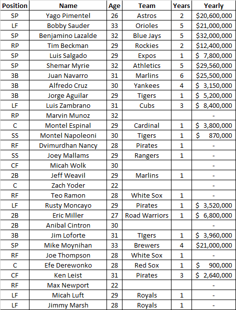 Yago Pimentel signed with the Astros for 2 years and a huge sum of over 20 million per year. I don't know what they were thinking as he is more likely to have a career-ending injury than to win any awards. Lazalde signed with the Blue Jays in a deal that will take him to his age 36 or 37 season. Sauder went all the way across the country to sign with the Orioles after being with the Dodgers for 7 years. |