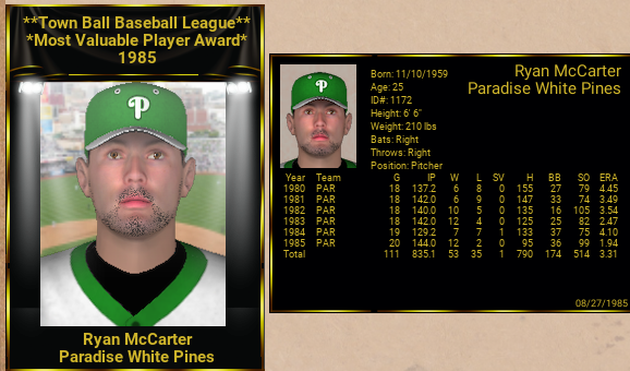 Ryan McCarter stole the show this past year. MVP, Pitcher of the Year, Town Ball Championship. The three time all star was unanimously selected as the Pitcher of the Year (Bruhan, notwithstanding) and edged Ann Arbor's Jerry Dees as the Most Valuable Player.