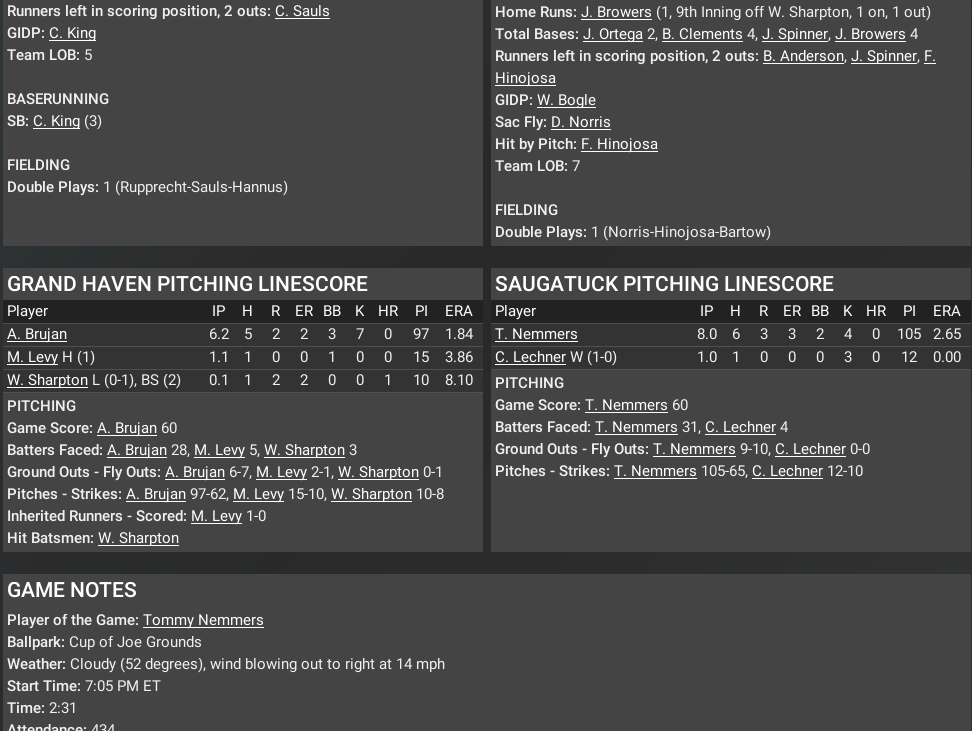 -Adrian Bruhan (Grand Haven) sets the all-time mark for wins (59). He has an undefeated 13-game streak. -Newcomer Jeff Grimm had a pretty good outing but was saddled with the loss because of an error allowing 2 runs to score. Grimm went 7.1 IP with three earned runs and collected one single in 4 AB's. He's the only P/DH at the moment. Still, the Freedom lost, again. -MVP/POY Ryan McCarter got the W for Paradise as he fanned 8 (walked 5) but had the support of the White Pine bats in the 11-2 win over Iron River. -Paradise newcomer Alex McKnight went 1 for 2 with a double and a pair of walks.