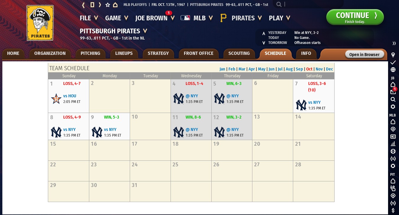 We face the Yankees again in the World Series after having lost to them in our two most recent World Series appearances. This time the Yankees don't appear as formidable as in the past. We won 99 games and they won 96. However The Python calls our expected wins 99 while it calls theirs on 89. The Yankees are first in the AL in runs scored but eighth in runs allowed. Staff ERA is sixth and poor fielding (-23.0 ZR) allows more runs to score. We are first in the NL in both runs scored and runs allowed. The Yankees rotation for the Series is all left handed. Right hander Sonny Siebert was the fifth starter during the season (fourth before the Yankees traded for staff ace Chris Short) and is in the pen for the Series. The Yankee hitters have good power but several have BAs below what would be expected based on their contact ratings. However I did some quick calculations and MLB scoring per game per team is 3.83 which is the lowest since 1918. Maybe the Year of the Pitcher arrived early. We led MLB in attendance this year beating the second place Yankees by about 125k. Our attendance was 2.3m. However $5.6m in total revenue puts us fourth in MLB with the number one Dodgers leading us by $400k. The Yankees are second and the Giants third. The move west by the NL NY teams was a good decision for them. We got an incredible performance from rookie RP Woodie Fryman. Set as Stopper 7th or later close with secondary high leverage he got into 76 games (NL high), with 143 IP, 2.08 ERA, 1.07 WHIP, and 18 saves. Incredible? Not done yet. He lost 7 games but won 15, exceeded on the team only by Bob Veale who won 18. |