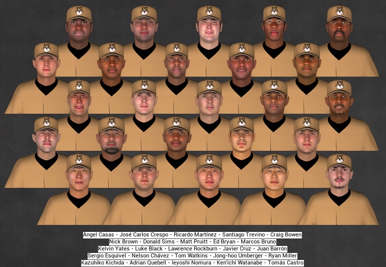 SP Nick Brown, 30, B:L, T:L (14-9, 2.68 ERA | 82-58, 2.97 ERA) – the left-handed part of our pair of co-aces had some struggles with command one year after missing significant time with a shoulder injury, but led the league with a 9.7 K/9 and set a new franchise mark for strikeouts with 243. He set the record for the fourth time in his career. SP Kelvin Yates, 30, B:L, T:R (21-3, 2.37 ERA | 92-89, 3.43 ERA, 1 SV) – electric right-handed co-ace, who led the league in wins and ERA and still didn’t get Pitcher of the Year honors; reached almost 200 more strikeouts than walks in ’07; you rarely ever have to worry about him. SP Javier Cruz *, 35, B:L, T:R (12-4, 3.28 ERA | 194-122, 3.73 ERA, 1 SV) – free agent fireballer with diverse pitch arsenal and pretty consistent career numbers; home runs might be a challenge for him, though. SP Jong-hoo Umberger *, 30, B:R, T:R (rookie) – international free agent of South Korean and Austrian descent; mixes above-average fastball and cutter with evil sliders and changeups SP Kenichi Watanabe, 31, B:R, T:R (5-5, 2.90 ERA | 17-29, 3.53 ERA) – Watanabe nibbles the corners, which sometimes works, and sometimes doesn’t. Missed more than half of 2007 with an injury, but came back well in late September. MU Kazuhiko Kichida, 28, B:L, T:R (5-5, 3.86 ERA | 12-13, 3.75 ERA) – there’s always that point somewhere in the season where you think Kaz has turned the corner, and then some violent outing happens in which he gets torn to shreds. Just not a reliable guy you can’t trust with a lead. He might snip walkoff singles in long marathon games from time to time, though. MR Tom Watkins *, 32, B:R, T:R (5-3, 3.27 ERA, 2 SV | 14-34, 3.82 ERA, 58 SV) – free agent addition; you can certainly do a whole lot worse for your fourth-best right-handed reliever. MR Lawrence Rockburn, 27, B:R, T:R (5-2, 2.18 ERA, 3 SV | 12-5, 2.49 ERA, 7 SV) – Raw Lockburn is consistently great in a seventh inning role, but can also be thrown into close situations. He has elite control, walking only 51 batters in 220 1/3 innings in his career. MR Ed Bryan, 27, B:L, T:L (6-2, 2.73 ERA, 3 SV | 14-7, 2.50 ERA, 4 SV) – his numbers look pretty good, if you want to glance over the seven home runs he allowed, which were mostly big and all too often costly. He is demoted from the setup role in favor of addition Donald Sims. MR Donald Sims *, 32, B:L, T:L (4-4, 4.19 ERA, 3 SV | 32-38, 4.00 ERA, 36 SV) – free agent addition designated for a left-handed setup role; SU Marcos Bruno, 32, B:R, T:R (7-1, 1.44 ERA, 2 SV | 28-25, 2.88 ERA, 58 SV) – struck out 70+ for the fourth straight year, while never walking more than 20, and posting a .84 WHIP. Could be a closer for just about anybody. CL Angel Casas, 25, B:S, T:R (6-1, 1.04 ERA, 48 SV | 10-6, 1.76 ERA, 120 SV) – as Angel is maturing, he gets more and more elite, nailing opposing lineups into the ground in the 2007 season; he would have broken Grant West’s mark of 49 SV in a year if not for the Coons’ collapse in September. His K/BB in 2007 was 8.2 – utter dominance. C Craig Bowen, 27, B:S, T:R (.253, 21 HR, 74 RBI | .231, 46 HR, 168 RBI) – leading the team in moustache and posting the best catching performance we’ve had in a decade, Bowen had a fantastic breakout season and we can’t wait for more. C Sergio Esquivel, 24, B:S, T:R (.264, 2 HR, 11 RBI | .254, 2 HR, 17 RBI) – once we dumped Bob Wood, Esquivel played a competent backup to Bowen, although he is not even a defensive upgrade over our primary. 1B Adrian Quebell, 25, B:L, T:L (.290, 5 HR, 42 RBI | .282, 17 HR, 120 RBI) – Quebell gives a good presence in the field and regularly appears on base, although he doesn’t quite generate a threat when there due to a lack of speed. His power is most disappointing for playing a traditional power position. 1B/2B Ieyoshi Nomura, 23, B:L, T:R (.242, 1 HR, 37 RBI | .271, 5 HR, 112 RBI) – Yoshi never got going and fell far off from his torrid 2006 campaign; his ceiling, we believe, is closer to the .745 OPS he hit for then than to the .617 he produced in ’07. His defense is at best average, though. 2B/SS Juan Barrón *, 35, B:R, T:R (.342, 1 HR, 33 RBI | .307, 32 HR, 853 RBI) – highly experienced and quite elite starting shortstop that arrived in trade with the Capitals; Barrón is excellent at getting on base as well as with the glove, winning four golden ones in his career, including the CL SS gloves in 2004 and 2005. Depending on the success of Yoshi, he might start at second base against left-handed pitchers. 3B Ricardo Martinez, 22, B:R, T:R (rookie) – showed prodigious power in AAA, but is not much of a defender, although he has some remarkable speed. He will be the third base starter to begin the year; if he struggles, we can still revert to Nelson Chavez. SS Ryan Miller, 23, B:R, T:R (.238, 2 HR, 20 RBI | .227, 2 HR, 20 RBI) – labeled as the future after a January 2005 trade with the Titans added him when he was a prospect, Miller has yet to live up to the billing. 3B/2B/1B Nelson Chavez *, 31, B:S, T:R (.253, 9 HR, 61 RBI | .259, 48 HR, 304 RBI) – excellent defensive third baseman that was signed as a free agent, who might more play a backup role to Ricardo Martinez. LF/1B Matt Pruitt, 24, B:L, T:R (.297, 11 HR, 61 RBI | .302, 14 HR, 77 RBI) – missed the first half of the year with injuries, but made his presence known in the second half. Not much of a defender, though, and there is still the possibility of moving him to first base at the expense of Quebell. LF/CF Tomas Castro, 24, B:S, T:R (.321, 19 HR, 87 RBI | .309, 37 HR, 189 RBI) – another player who had quite the breakout year and currently has the longest guaranteed contract on the team, having been signed through 2012 at rather team-friendly terms; while he is not much of a defensive centerfielder due to an arm grading out as poor, he more than made up for his in-field shortcomings by wielding a pretty lumber in ‘07. RF/LF/CF Luke 