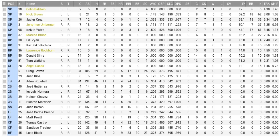 While the Raccoons’ .307 batting average wouldn’t last, the Titans’ 6.7 R/G wouldn’t either. Probably. They had been on fire offensively, but equally important their starting pitchers had so far posted the lowest ERA in the league. Projected matchups: Javier Cruz (1-1, 8.00 ERA) vs. Jesus Elmore (1-1, 5.93 ERA) Jong-hoo Umberger (2-0, 2.45 ERA) vs. Ray Conner (1-0, 1.80 ERA) Kenichi Watanabe (0-2, 5.73 ERA) vs. Jorge Chapa (2-1, 1.21 ERA) Following former Coons farmhand, right-hander Jesus Elmore, it will be two well-known southpaws. More left-handers might follow on the weekend in Las Vegas. Oh, and the weather forecast for the week is dreadful. Game 1 BOS: 2B J. Ramirez – 3B M. Austin – RF Brulhart – C Suda – CF Ja. Gusmán – LF P. Flores – 1B Ju. Gusmán – SS Heffer – P Elmore POR: SS Barrón – CF Castro – LF Pruitt – RF Black – 1B Quebell – 3B R. Martinez – C Bowen – 2B Nomura – P Cruz The Titans came in with a 9-game winning streak and set an exclamation mark immediately, with Jesus Ramirez drawing a leadoff walk from Javier Cruz, who was not at all what we had imagined from our #3 starter early on in the season, and to underline that statement he instantly surrendered a 2-run homer to Mark Austin. While Cruz continued to suck himself out of favor, allowing another 2-piece to “Quasimodo” Suda in the third, the Raccoons had slowish Quebell, who had extended his hitting streak to 14 games, thrown out at home by Jim Brulhart in the second inning. While the Critters did get on the board with Pruitt’s RBI double in the bottom of the fourth, Elmore didn’t allow nearly as much to them as Cruz handed out for free. Jesus Ramirez would end his day with a solo home run with two outs in the sixth, then giving the Titans a 5-2 lead. Kichida was nicked for another run in the seventh, but the Raccoons actually had some juice left. In the bottom of the inning, Bowen and Nomura got on before Chavez and Barrón hit grounders for outs at second base, but Bowen scored. Castro then rapped a single to left, and Pruitt doubled to get us back to 6-4 with the tying runs in scoring position for the Duke. The Titans foolishly stayed with Elmore and paid for it dearly when the Duke hopped a 1-2 pitch over the second base bag into center, tying the score at six. Ed Bryan was tasked with PH Rudy Garrison and the two lefties atop the order in the eighth, but Garrison reached with a single. Marcos Bruno inherited the runner at third with two outs, facing Brulhart, and allowed a hard grounder to short on the first pitch that Barrón played successfully into the third out – the last out on the day. Between innings, rain set in, and instantly got quite calamitous. The game went to delay and was ultimately suspended. The next day, the skies were still gray and potentially just waiting to open up. The Coons went down silently in the bottom 8th, but Bruno was still in and pitched a perfect ninth, enabling a walkoff. The inning started with Santiago Trevino, who had come in for defense, but was the first of three batters to fly out. Bruno pitched another inning, and then Rockburn pitched three frames. The offense couldn’t pick up the sticks, however, facing another lockdown pen in the blue shirts. Nomura reached on an error by Dave Heffer in the 11th, but nothing came of that. Manuel Martinez was in his third inning when Luke Black reached on an error by Mark Austin to start the 13th inning. Ryan Miller hit for Rockburn, singled, but then Ricardo Martinez grounded a 3-1 pitch to short and HEFFER THREW IT AWAY!! Heffer’s throw went past double play partner Daniel Silva, and the Raccoons loaded the bases with no outs! And the best: before Craig Bowen could do anything stupid, Manuel Martinez’ next pitch was wild, got far away from Suda, and the Coons walked off! 7-6 Coons! Pruitt 2-6, 2 2B, 2 RBI; Black 2-6, 2 RBI; Miller (PH) 1-1; Bowen 2-5; Bruno 2.1 IP, 0 H, 0 R, 1 BB, 3 K; Rockburn 3.0 IP, 2 H, 0 R, 1 BB, 2 K, W (1-0); … and there’s the first decision for our pen this year. Took some time, and it’s a win, yay! Of course we shredded our pen quite badly for Jong-hoo’s start that followed right after this. Also, with Bowen having already caught five innings on the day, we gave Juan Rios the start in the middle game for his major league debut, which gives us Bowen to pinch-hit. Game 2 BOS: 2B J. Ramirez – LF Garrison – C Suda – CF Ja. Gusmán – 1B R. Vargas – 3B M. Austin – RF P. Flores – SS D. Silva – P Conner POR: 2B Barrón – 1B Quebell – CF Castro – RF Black – LF Pruitt – 3B R. Martinez – SS R. Miller – C Rios – P Umberger Jong-hoo pitched well, and when another 2-run homer was hit in the first inning in Portland, it belonged to the home team; Tomas Castro bombed Ray Conner into an early deficit, then created a run in the third when he stole second base with two outs to get into scoring position, then scored on Black’s single to left to make it 3-0. While you were never out of the bushes with a 3-run lead, Umberger certainly made it appear like much more. The Titans just weren’t getting anything off him. Then the Raccoons swiftly doubled their lead in the bottom 7th with three consecutive 2-out RBI doubles by our 2-3-4 guys to get to 6-0. Umberger was still strong in the eighth, then was chased by rain. Donald Sims took over and spoiled the shutout party when he allowed a homer to Rudy Garrison in the ninth. 6-1 Raccoons. Quebell 2-3, BB, 2B, RBI; Castro 2-4, HR, 2B, 3 RBI; Black 3-4, 2B, 2 RBI; Umberger 7.2 IP, 4 H, 0 R, 0 BB, 6 K, W (3-0); Doubtful whether Jong-hoo, who has yet to walk a major league batter, would have completed the shutout, as he was already at 102 pitches when the game went to delay, but his performance went a great way to conserve the pen that had been squeezed already. Juan Rios drew a walk his first time at the plate, but did not get a hit. Game 3 BOS: 2B J. Ramirez – LF Garrison – RF Brulhart