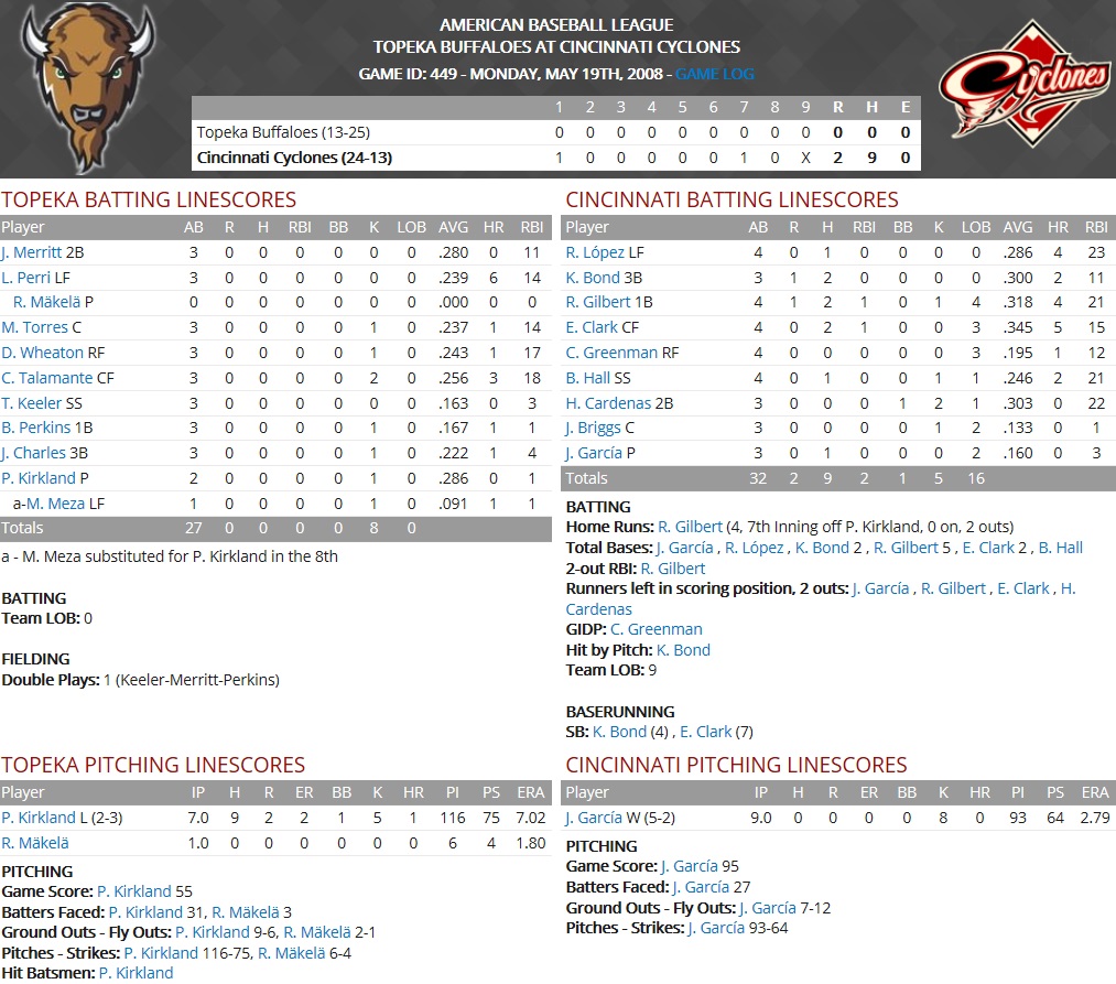 Raccoons (26-16) @ Bayhawks (19-26) – May 27-29, 2008 Already sinking rapidly in the South, the Bayhawks had a leakage in their rotation and couldn’t get it fixed. Their starting five put up an ERA of almost as much, and the bullpen was average at best. The offense didn’t keep up, and this was a perfect recipe for a .422 team that wasn’t going to get any better. They are the last CL team we hadn’t played against so far this season. Watch out for 3B David Lopez, who has taken over the lead in the home run race with 11 dingers, batting almost .340; Projected matchups: Jong-hoo Umberger (5-2, 2.15 ERA) vs. Harry Wentz (2-4, 4.06 ERA) Colin Baldwin (1-2, 3.86 ERA) vs. Tyler Sullivan (4-1, 3.64 ERA) Javier Cruz (2-2, 5.32 ERA) vs. Angel Romero (2-2, 5.76 ERA) Yes, THAT Angel Romero. He’s 37 now. He was 35 when he stunk in Portland. We are sliding Cruz into the #5 hole utilizing the off day on Monday that would have been his usual turn in the rotation. That doesn’t mean he’ll get skipped regularly from now on, but this is a measure to separate the left-handed B-Boys in the rotation, Baldwin and Brown. Game 1 POR: 1B Quebell – CF Castro – 3B R. Martinez – RF Black – LF Pruitt – C Bowen – SS Barrón – 2B Nomura – P Umberger SFB: LF Ware – RF Hudson – 3B D. Lopez – 1B I. Gutierrez – RF Keshishian – C P. Fernandez – 2B J. Perez – SS Nakayama – P Wentz Both starting pitchers hurt another with singles in the third inning. While Wentz plated Jose Perez with his 1-out RBI single, the Coons’ Korean jewel had reached base with a single to start the top 3rd. Quebell also got on before Castro reached a 12-game hitting streak with a 3-run home run, the first tally in the game. Ivan Gutierrez’ homer in the bottom 4th further shortened the score to 3-2, but the Raccoons came back in the sixth. Barrón’s leadoff single was followed by a liner off Yoshi Nomura’s bat that escaped Tirgen Keshishian for an RBI triple, and while Umberger became the first of the two pitchers to not reach base safely in five attempts in the game, his groundout at least scored the runner from third to get the Raccoons to 5-2. The Raccoons had already stranded men on third twice (and had Black thrown out at home to end another inning) when Umberger was sent to bat with runners in scoring position and two outs in the seventh. Wentz struck him out on three pitches, but Umberger came back with a scoreless bottom 7th to make it not a bad move at all. He struck out pinch-hitter Urbano Cicalina at the start of the bottom 8th before leaving for Ed Bryan to face the lefty Stephen Ware, who hit a triple. Raw Lockburn struck out John Hudson before David Lopez, hitless in the game, grounded out to Nomura, and Angel saved the game without too much fuss. 5-2 Raccoons. Martinez 2-5; Bowen 2-4, BB, 2B; Barrón 3-3, BB; Umberger 7.1 IP, 4 H, 2 R, 2 ER, 3 BB, 9 K, W (6-2) and 2-4, RBI; Game 2 POR: 1B Quebell – 3B R. Martinez – CF Castro – RF Black – C Bowen – SS Barrón – LF Crespo – 2B J. Gutierrez – P Baldwin SFB: CF Hudson – 2B J. Perez – 3B D. Lopez – RF Keshishian – 1B Nakayama – C P. Fernandez – LF M. Rodriguez – SS McCullough – P Sullivan We probably knew what to expect from Baldwin once he took the mound for the bottom 1st and faced to the wrong side, staring at Tomas Castro far out in centerfield. Castro stared back with a blank expression. Baldwin’s start soon descended into chaos, with the leadoff man reaching in every inning, and there was another black hole, defensively, at third base, where Martinez did not only not make the extraordinary plays, but not even the basic plays. Somehow the picture remained hanging on the wall through four innings of only one run scoring (and one cut down at home by Crespo), and the Raccoons even took a 3-1 lead in a 2-run top 5th featuring a Martinez RBI triple (he scored on a passed ball), but in the bottom 5th Baldwin loaded the bases with no outs, featuring two walks, and it just blew up. Pablo Fernandez’ RBI single made it 5-3 Bayhawks with still only one out, and Baldwin was yanked. Watkins retired Manuel Rodriguez and Brandon McCullough to end the inning, but the damage was immense. Also considerable: the number of runners the Raccoons left in scoring position. One each in the first two innings, and two each in the fifth and seventh. Duke Smack’s leadoff jack in the eighth then had impressive length, yet insufficient weight to make up the difference, but he got another chance with two outs in the ninth of the 5-4 game, facing ex-Coons farmhand Salvadaro Soure, who had just allowed 2-out singles to Martinez and Castro, but here the Duke was too eager and got blacked out. 5-4 Bayhawks. Quebell 2-5, 2B; Martinez 3-5, 3B, 2B, RBI; Castro 2-5; Black 2-5, HR, 2B, RBI; Watkins 1.2 IP, 1 H, 0 R, 0 BB, 1 K; Tom Watkins’ elbow was balking after this game and it wasn’t better the following morning. We had him examined, but couldn’t find any structural deficiencies. The medical staff shrugged and filled in the form with the official ailment of “tender elbow”, which would render him diminished for the next week. The question was whether we would want to run around with a diminished pitcher for that long, or go to a replacement for two weeks. We have been using the DL quite aggressively so far this year and I’m not intent on changing that. Watkins was disabled, and a replacement was shipped in from Florida in the Alley Cats’ closer, Matt Cash. Now 25 and still walking people, it will certainly be a temporary assignment. We also exchanged Jose Gutierrez and Ryan Miller again. Gutierrez’ novelty factor had worn off, and Miller had batted .320 with gap power in St. Pete, so we welcomed him back. Game 3 POR: 2B Barrón – 3B R. Martinez – LF Castro – RF Black – 1B Pruitt – C Bowen – SS R. Miller – CF Trevino – P Cruz SFB: LF Ware – CF Hudson – 3B D. Lopez – 1B I. Gutierrez – C P. Fernande