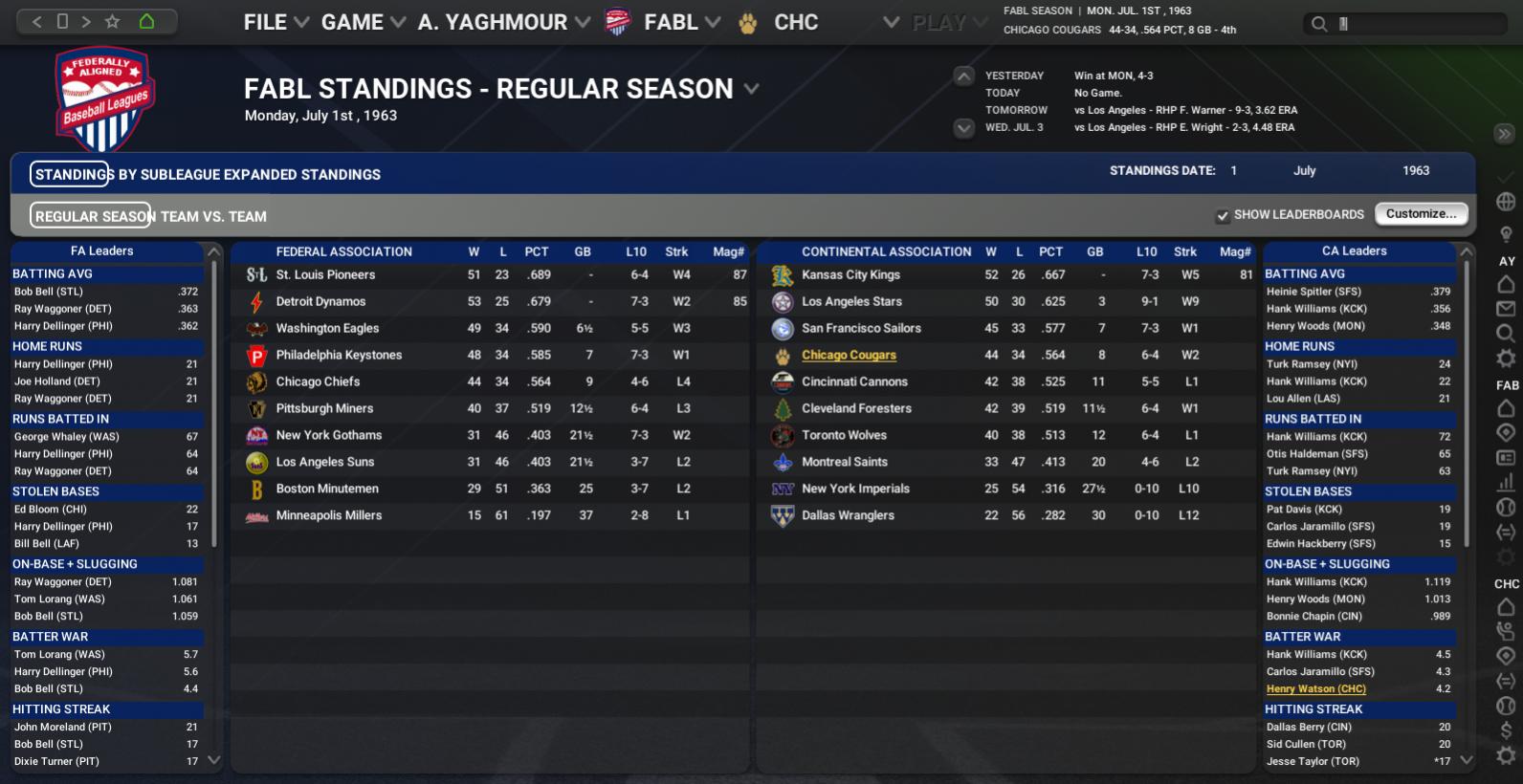 A healthy Jack Gibson is apart of it, as he homered in two of the one-run victories and each of his last four games. Now with 19 in just 188 PAs, he's still fourth in the CA and five off the lead. Gibson drove in 9, 7-for-20 with 6 runs, a double, a walk, and 9 RBIs. With a .306/.335/.688 (168 OPS+) season line, he's making a push for All-Star consideration, though I can't see him starting over the batting title leader Heinie Spitler (.381, 5, 42, 9). Henry Watson will be there for sure, as after a 6-for-23 week he's been worth exacting 4 WAR in 71 games. Adding a triple, two homers, seven RBIs, and a steal, he's hitting an outstanding .337/.380/.588 (157 OPS+) with 13 doubles, 6 triples, 15 homers, 19 walks, 5 steals, 43 runs, and 55 RBIs. What will be a second nod, Watson turned 25 last month, and currently ranks as the #1 right fielder and FABL's 19th best player overall. 1963 has been a huge breakout year for our young outfielder, solidifying himself in the lineup despite the emergence of the now graduated 2nd ranked prospect.