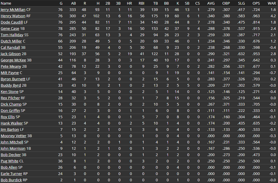 Jack Gibson : 23 AB, 8 H, 1 HR, 3 RBI, .348 AVG, .945 OPS