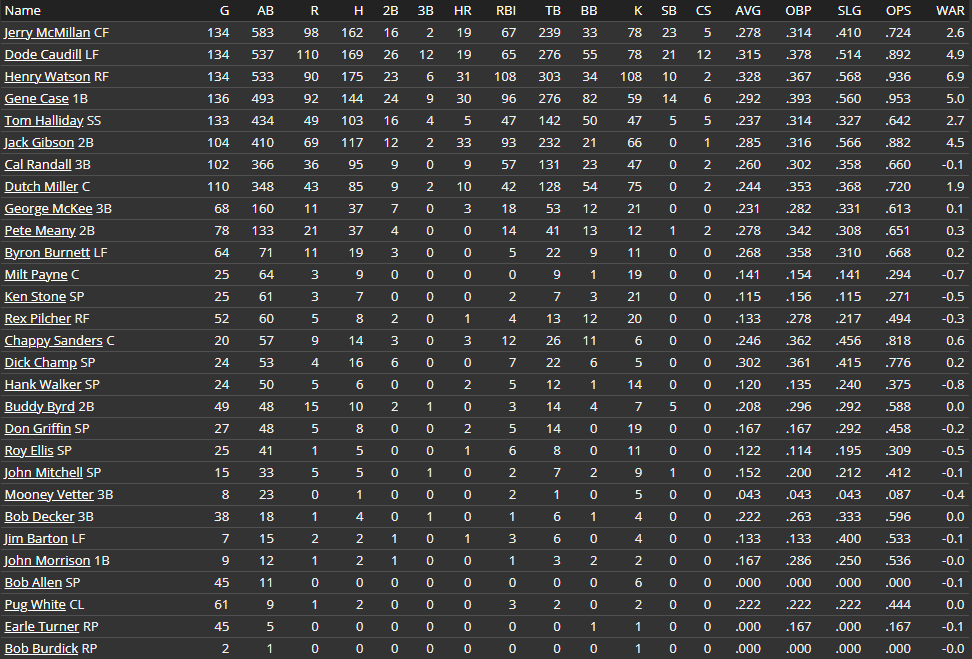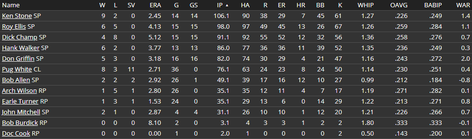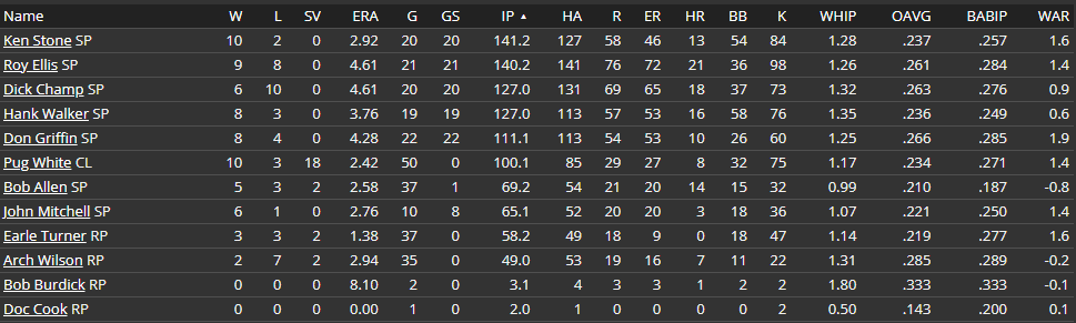 Big weeks also came from Cal Randall and Dode Caudill, while a collection of bench pieces impressed in limited time. Randall hit his 10th homer of the season, 10-for-24 with a double, triple, and 5 runs scored and driven in, while Dode hit his 20th longball and collected a triple, steal, 6 runs, 3 RBIs, and 3 walks in an 11-for-31 effort. Obviously Dode has been great all year long, but since returning from the IL Randall has slashed a strong .304/.353/.429 with 6 doubles, 5 homers, 22 runs, 32 BRIs, 14 walks, and a triple. This has improved his season line to a more respectable .269/.309/.377 (83 OPS+), and if we can get add a bat to the lineup he's making himself look like an easier plan B. If we do add someone, he could join Pete Meany (5-11, 2B, 2 RBI, R, 3 BB), Chappy Sanders (3-10, 2B, HR, RBI, 3 R, BB), and Mooney Vetter (1-5, HR, 3 RBI) in competition for a bench role. All three made the most of their time this week, but the life of a bench player is not always that easy.