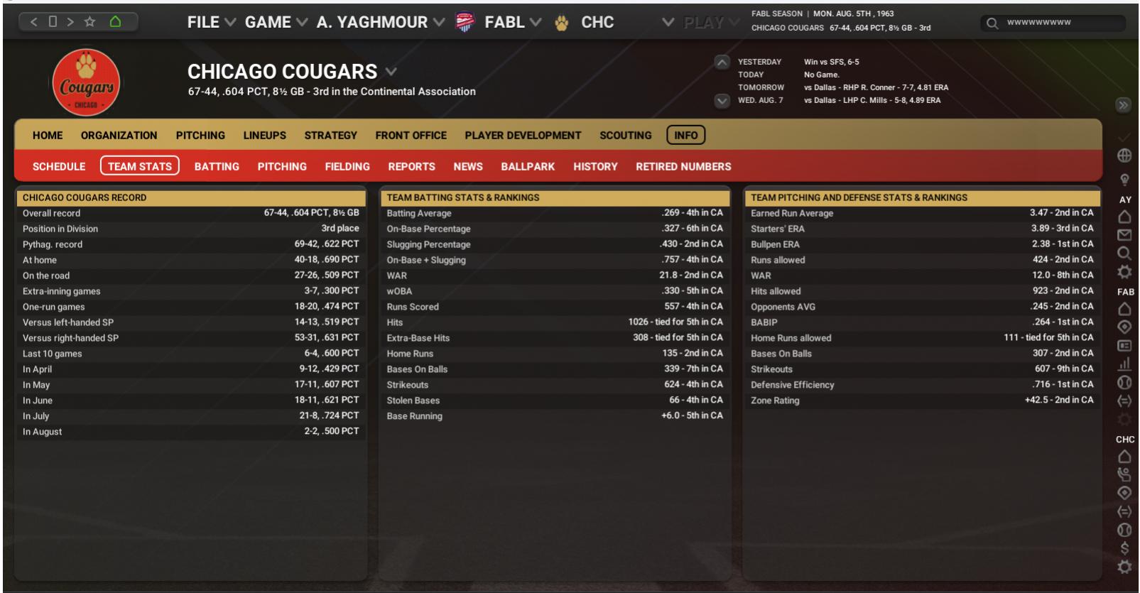 Another 5-win week for the Cougars, and this time we actually made up ground! A full game and a half on the first place Kings, who now lead us by just 5.5. LA is two above us, and without getting too far ahead of ourselves, they're our next opponent. Instead, let's reflect on the impressive homestand, as we took two of three from the Foresters before sweeping the Imperials out of Chicago. I cannot believe I'm writing this, but one-run games were actually the highlight of the week, as we won two of the three with the Foresters, before winning our fourth of the week on Saturday. After the abysmal start, we've won 6 of our last 7 one-run games, a more respectable 12-15 on the season.