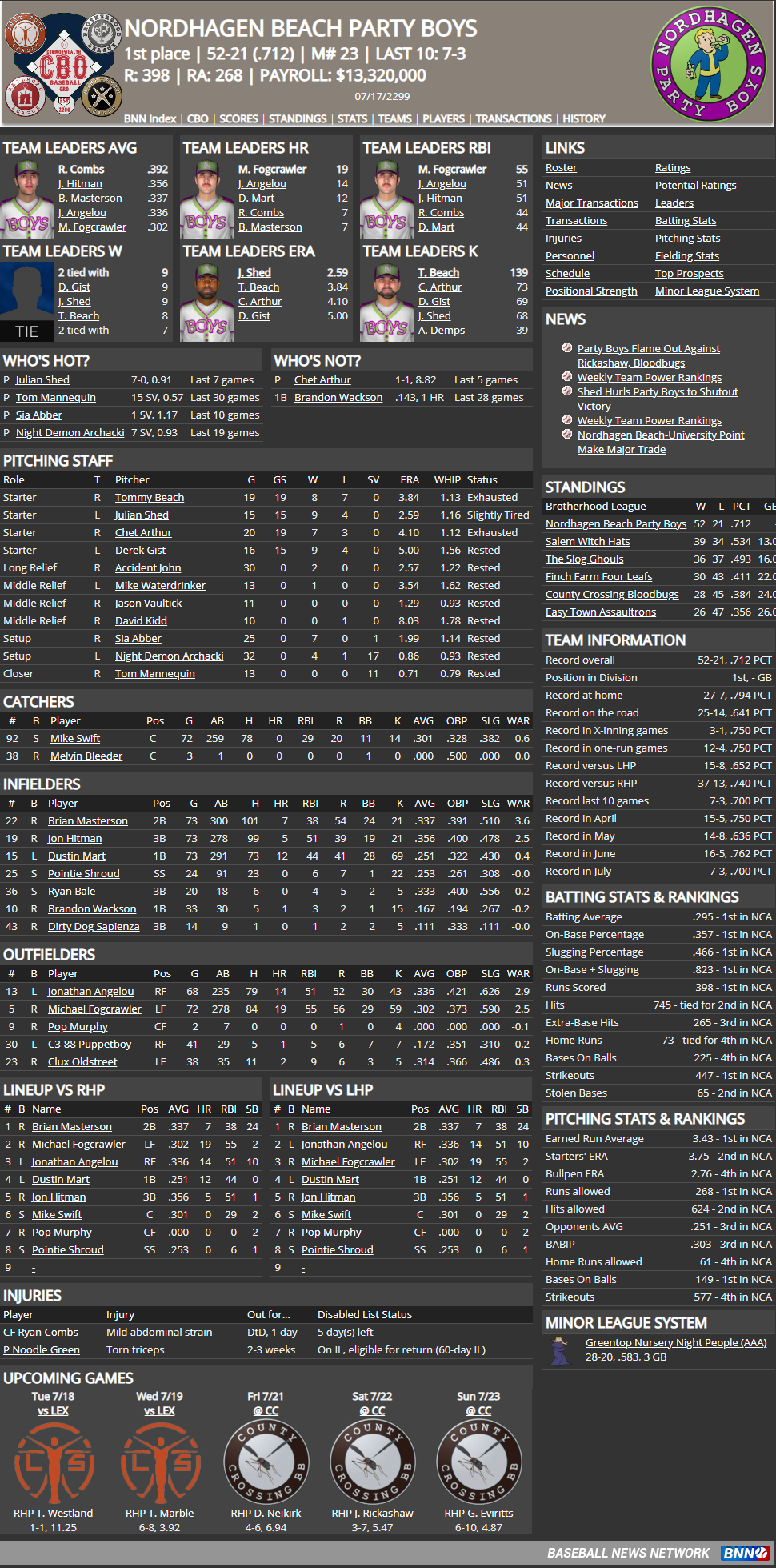 Today in the CBO News and Notes - Reports from around the Commonwealth by Nat Wright-Kawolski 21 July 2299 - County Crossing Roughed Up By Party Boys' O The Nordhagen Beach Party Boys easily defeated the County Crossing Bloodbugs, 12-3, at Beantown Brewery Stadium, with first baseman Dustin Mart a main contributor to the win. He slugged 2 home runs, while scoring 3 runs and driving in 6 for Nordhagen Beach. Pop Murphy, not ready to give up his spot to the returning Ryan Combs, was 3 for 5 with a double, two home runs, three runs, and six RBI. Nordhagen Beach has an impressive 54-22 record, tops in the CBO. Mart had a key at-bat for Nordhagen Beach early in the game. With runners on 1st and 2nd, he hit a 3-run home run. It was his 16th home run of the season and gave Nordhagen Beach an early 3-0 lead. "We did a lot of things right," said Mart. Derek Gist picked up his 10th win to move to 10-4 on the season. In 6.0 innings, he allowed three earned runs on seven hits with three walks and four strikeouts. He allowed homers to Mush Levy (12) and Taygun Topaloglu (6) in his final inning pitched. 21 July 2299 - Deathclaws Take It on Chin, Lose, 11-0, to Goodneighbor Matt Pageturner was in a mood to talk following the Goodneighbor Hancocks contest against the University Point Deathclaws, expounding to BNN reporters on his pitching philosophy. He had good reason to be excitable, having tossed a complete-game shutout of the Deathclaws, 11-0. "There are three important elements in pitching success: location, location, and location," Pageturner said. "I was hitting my spots time and time again." The right-hander blanked University Point on a 5-hitter, allowing 3 walks and racking up 4 strikeouts. In 20 starts this season Pageturner has compiled a 14-2 record and a 3.39 ERA. With Goodneighbor, he is 7-0 with a 2.96 ERA. The Hancocks offense was also firing on all thrusters, with Bryan Assman going 3 for 5 with two home runs (22 + 23) with two runs and three RBI. Jason Juras also hit two home runs (19 + 20), going 2 for 4 with a walk, three runs, and five RBI. Burtie Cuttooth also added his 12th home run of the season. Assman and Juras represent the only teammates in the CBO currently with 20+ home runs. Finch Farm is the only other team on the brink with two players at 19 homers each. 21 July 2299 - Adamantium Take Down Synths, 5-4, in 10 The Abernathy Adamantium racked up a win at Tato Field, bumping off the Lexington Synths, 5-4, in 10 innings. Kyle Clevinger, who started for Abernathy, pitched effectively for his team. Abernathy has run its win streak to 4 in a row. The Adamantium procured the win, in large part because of pinch hitter Lucky Libow. In the bottom of the tenth, he produced the game-winning run-scoring single. Libow said afterward that he was "glad the fans were treated to a good ballgame." Joel Mutfruit, third baseman for the Abernathy Adamantium, ran his consecutive-game hitting streak to 20 games with 1 hit in his club's victory today. "Not the outcome we wanted," Lexington manager Sprole Races said. "There's never a good time to lose, and it's never fun to be on the wrong end of somebody else's accomplishment." Mutfruit flied out in the 1st, walked in the 4th, singled in the 6th, struck out in the 7th, and flied out in the 9th. So far this season Mutfruit has hit .286 with 7 home runs, 45 RBIs, and scored 43 times. 21 July 2299 - Chemists Curb Silver Shroud, 2-1 Sunshine Tidings starter Bill Sarnacki pitched well against the Fort Hagen Silver Shroud at Hubris Comics Park. The left-hander led his team to a win, 2-1. Vince Moon converted his 5th save in 6 tries. The Chemists sport a record of 31-45. The Chemists got an important contribution from center fielder Frank Corsica, who in the top of the third knocked a 2-1 fastball into left-center for a run-scoring double. It was his 30th double of the season and put the Chemists ahead, 2-0. "Winning never gets dull," said Corsica. Sarnacki (5-11) pitched one of his better games of the season, holding the Shroud to just one earned run on seven hits with two walks and four strikeouts in 8.0 innings. His best game came June 2 against Abernathy when he held the Adamantium to just one run while striking out 11 in 8.1 innings. 21 July 2299 - Swatters Lose Late, 7-3 The Oberland T-51s topped the Diamond City Swatters by the score of 7-3, with the largest share of the credit going to second baseman Jonathan Abern. Abern went 2 for 4 with a triple. He scored 2 times and drove in 3 for the T-51s. Matt Udder, the winner, improved to 10-7. He held Diamond City to 3 runs on 6 hits over 7 innings, while racking up 6 strikeouts. The victory gives Oberland a record of 40-36, 12 games back of the Swatters. Abern came through with some timely hitting for Oberland. With Diamond City trailing 3-2 in the top of the eighth, Abern hit a full-count curveball for a bases-clearing triple. His 13th triple of the season made it 5-3, Oberland. "When this team comes together and plays the way we can, we can compete with anyone," said Abern. "I think we're going to keep proving that."