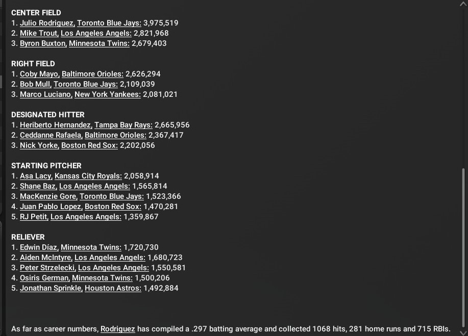 Cease has gone 7-6 with a 2.77 ERA in 18 starts during his second season with the Cardinals. The 32-year-old has made his second All-Star team, having also made it 2023 when he was pitching for the Chicago White Sox. This will be the ninth All-Star game for the 40-year-old Goldschmidt but just his first as a member of the Cardinals. His other eight selections came while he was playing for the Diamondbacks. This season, Goldschmidt, who has primarily served as the team's designated hitter, has hit .277 with 18 homers, 59 RBIs and 51 runs scoring in 81 games. This will be the first All-Star appearance for the 29-year-old Zuniga. He has pitched in 41games for St. Louis this season, going 2-1 with a 2.51 ERA. |