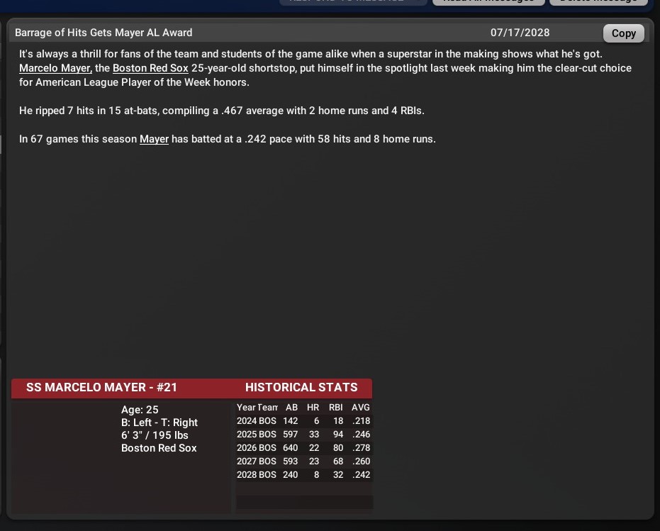 This season the 20--year-old has been playing at Class A Palm Beach, where in 78 games he has hit. 275 with four home runs, 22 RBIs and 32 runs scored. |