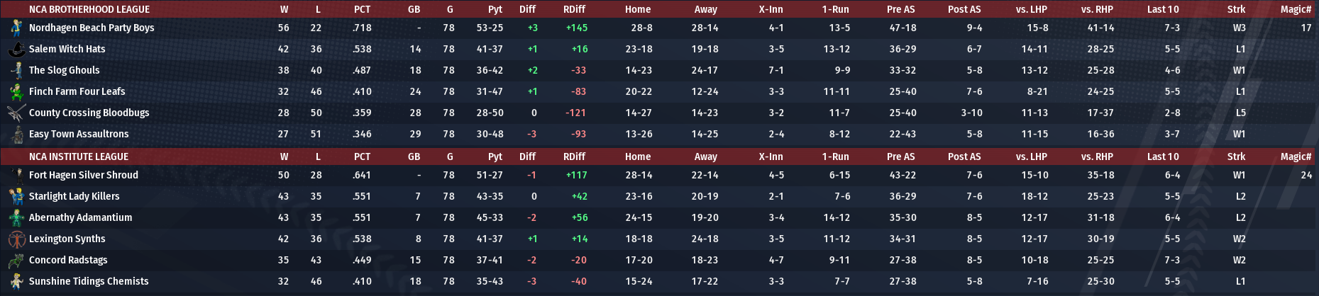 I guess what I'm saying is, seasons like this happen, and personally I'm just as excited at this point as I would be during a different season. Even if the lead seems set, there's always drama be to found somewhere, and you never know what can happen in playoffs! (Plus in a dynasty like yours, we have this nice narrative wrapping of the Fallout setting to provide extra-curricular drama too )