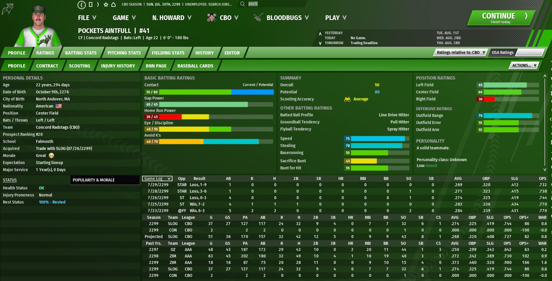 Today in the CBO News and Notes - Reports from around the Commonwealth by Nat Wright-Kawolski 26 July 2299 - The Slog Ghouls Ship Aintfull to Concord Newspapers in The Slog and Concord reported that the Ghouls have reached a deal sending 22-year-old LF Pockets Aintfull* and 20-year-old minor league LHP Smelly Schmelzer to the Radstags for 30-year-old RHP Gwinnett Southie and 20-year-old C Shawn Cherry. Aintfull is currently batting .274 with no home runs and 7 RBIs. This season Southie has fanned 77 in 133 innings and collected a 7-8 record with a 4.53 ERA. 26 July 2299 - Nuka goes 3-for-4, Leads Silver Shroud to Win Fort Hagen left fielder Andrew Nuka made his presence felt in the 9-5 Silver Shroud triumph over the Salem Witch Hats. Nuka was 3 for 4 with a home run and a double. He scored 3 runs and drove in 5. The winner was Brent Hooker, who threw 123 pitches over 8 innings. The left-hander was charged with 3 runs on 11 hits. Fort Hagen improves to 52-28 with the win. They lead their division by 7 games. Nuka contributed a big hit, a 2-run home run, for Fort Hagen in the bottom of the fourth. With his team trailing 2-1, Nuka took a slider from Terrence Artman and stroked the home run to center. His 19th home run of the season allowed the Silver Shroud to leap in front, 3-2. "We're just going to try to build off this win," said Nuka. 26 July 2299 - Sarnacki Sizzles, The Slog Fizzles Bill Sarnacki was throwing strikes early and getting ahead in the count, his manager said after the Sunshine Tidings Chemists hurler tossed a 3-hit, complete game shutout against the The Slog Ghouls. "I went right after each hitter, trying to get ahead in the count," said Sarnacki. "I wanted them to swing the bats and keep my pitch count down. It worked. I felt strong the whole game, even in the last two innings." Sarnacki walked 0 and struck out 6 in the 3-0 victory. In season stats Sarnacki shows a 6-11 record in 20 games, 130.1 innings, 113 strikeouts and a 5.11 ERA. 26 July 2299 - Rose Helps Hancocks Beat Knuckle Punchers, 12-6 Goodneighbor took on Roxbury in front of a lively crowd. John Rose impressed in the 12-6 Goodneighbor win over Roxbury. Rose, who finished 5th in the SCA in wins above replacement with 5.5 last year, was 3 for 4 with a home run and a double. He scored 2 times and drove in 4. The victory gives Goodneighbor a record of 55-25. Goodneighbor used a well-timed hit by Burtie Cuttooth to capture the win. The shortstop socked a 2-run double in the top of the first inning to put the Hancocks ahead, 3-0. Though it was his only hit in 4 at-bats, it was important. "We played hard and won," said Rose. "Sometimes, baseball really is that easy." 26 July 2299 - With 5-2 Win, Synths Improve to 44-36 Lexington rode a decent outing from starter Lawdog Whipple to victory over the Nordhagen Beach Party Boys. The final score was 5-2. Lexington has now won 4 in a row. In the top of the ninth, Ryan Combs stood in the box, looking for a pitch to hammer. The Party Boys were trailing 5-2, but had the bases loaded. That's when Adam Bias made a terrific pitch and Combs grounded out. Gone was the dream of a Nordhagen Beach comeback. 26 July 2299 - Clutch Hitting Delivers Win for Swatters Diamond City Swatters starter Tyler Powers was in a groove as he led his team to a win over the Atom Cats, 5-1. Powers picked up the win for Diamond City, going 7 innings. He gave up 1 run on 4 hits. He now sports a record of 11-3. Diamond City, at 54-26, is 12 games up in the South Charles Association Railroad League. Diamond City used the clutch hitting of Wayne Lacy to capture the win. The right fielder drilled a 3-run home run in the top of the eighth inning to put the Swatters ahead, 4-1. It was his only hit in 4 at-bats, but it was a big one. "We'll kick back tonight, then get set for the next one," Powers said.