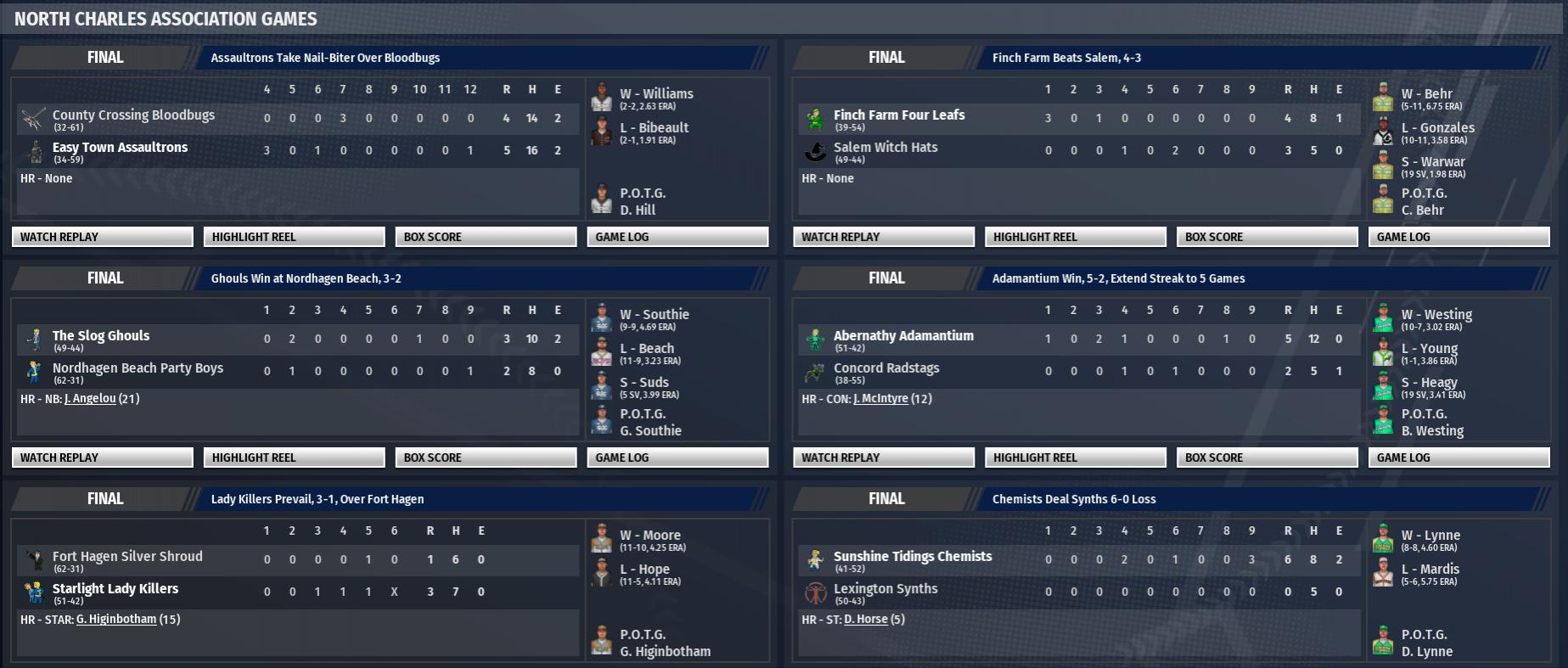 Today in the CBO News and Notes - Reports from around the Commonwealth by Nat Wright-Kawolski 15 August 2299 Trashcan Carla-Jason Saum Detail Offseason Plans There is one thing obvious in the BMU: The Lexington Synths' BMU team, the Union Hope Lifegivers, are not competitive. One of the biggest reasons is the lack of talent. That became even more evident when the Synths traded away three highly-talented players two weeks ago to obtain the services of 2B Bubb Islander from Vault 81. Commissioner Nate Howard has already expressed that moves must be made with a purpose for winning, and he is not happy with the lack of competition that the Lifegivers offer in the Cambridge League. According to a statement from the CBO headquarters, Howard described Lexington GM Jason Saum's front office style as "unacceptable." Union Hope has won only two games since the All-Star Break, gaining one 11-inning victory and one victory last week at College Square to break a 14-game losing streak. Before their last victory on July 12, the Lifegivers were on an eight-game winning streak. They have also had nine-game and 10-game losing streaks. Owner Trashcan Carla and Saum are now detailing a plan to redistribute talent and work to make the 2300 Union Hope team one that can win better than their .159 winning percentage. "Small goals," Saum was quoted as saying. "We have four draft picks in the first two rounds, so we are going to go with sure picks over gambles. We'll see how the Synths finish up, too. If we make the playoffs, we'll evaluate our core and then see about making some moves for regulars to prospects to build up Union Hope. We have some goals." According to Saum, Trashcan Carla has agreed to step back more and let the scouts and GM do their jobs. Carla has a reputation of managing the team much like she manages the Super Duper Mart franchises, valuing profit through quantity rather than quality. The Synths have being built to win at the CBO level with no regard for the BMU level. The problem there is that lack of long-term growth may lead the Synths to be non-competitive in the CBO, which would go against the agreements Howard made when selecting team owners. Howard built the league on a central core that can take control of non-competitive teams. While there are teams that have not had success--for example the Brotherhood League's County Crossing Bloodbugs, which finished in 6th place all three years--Howard still considered them to be competitive in the sense of developing players and winning enough games. Howard does not consider a winning percentage below .300 to be acceptable for competition. The actions the Synths would have to take are laid out in their plans, but Howard may be involved in those offseason moves, too. That could indicate the Lexington team is not as likely to make a potential playoff run in 2300 until it can find enough youngsters to develop at the CBO level. Even with some talent, there is just not enough, and players are tired of the losing. Some who have expressed that frustration include 2298 2nd-round and 3rd-round picks CL Van Funky (2-8, 9,41, 5 SV) and SP Jaa Thirtysix. According to Thirtsix, "Our best hitter is batting [.212]. Our defense averages two errors a game. Our pitching gives up 8 a game. We cannot win a game unless the other team has a bad day." Thirtysix is 0-10 with a team-worst 10.58 ERA. Salem Losing Patience with Prynne? The Salem Witch Hats seem to be growing increasingly impatient with the progress of prospect Heston Prynne, a part-time outfielder with the Witch Hats' club after being called up earlier in the season. When he was called up, the expectation was that he would claim an OF spot to help the team in their playoff goals. Instead, in 23 games as a pinch hitter, Prynne (.294/0/3) is still stuck behind the trio of Tyler Spronk (.292/18/68), Chris Treestump (.272/20/63), and Mike Castillo (.284/7/36). Prynne was most likely to unseat Castillo, which would have opened up Castillo to be traded to improve the infield. Now that the Witch Hats are struggling to fend off the The Slog Ghouls, that infield position seems to be a crucial lacking part of their playoff pursuits. Hall goes 4-for-5 in Bloodbugs Win Behind a solid performance from right fielder Long Hall, the County Crossing Bloodbugs defeated the Starlight Lady Killers, 10-8. Hall was 4 for 5 with a home run, a double, and 2 singles, while scoring 3 runs and driving in 4 for the Bloodbugs. County Crossing pitcher Chopsticks McWilliams got the win. He's now 7-1. John Walden was tagged with the loss. William Whitehurst earned his 13th save in 15 chances. Had Mushy Levy not delivered a key base hit in the bottom of the eighth, the outcome might have been different. Instead, with two down and runners on 1st and 3rd, Levy hit a run-scoring single. That made the score 9-8, in favor of the Bloodbugs. "We try to keep the mood light around here," said Hall. "Winning helps." The win has County Crossing at 33-61. Ramos Shines in 6-4 Sunshine Tidings Win Getting offensive support from Brightsun Ramos, the Sunshine Tidings Chemists topped the Easy Town Assaultrons, 6-4. Ramos was 4 for 4 with a home run, a double, and 2 singles. He scored 2 times and drove in 2 for the Chemists. The winning pitcher was Jamie Collins. His record is now 3-9. The left-hander went 8 innings, allowing 4 runs on 5 hits for the Chemists. Handsome Frank got the save, his 13th in 17 chances. The Chemists had to work out of trouble in the top of the ninth. The score was 6-4, Sunshine Tidings, with one out. Easy Town, with a runner on 2nd, was mounting a threat. Joe Ransom dug in at the plate, but on a 3-1 slider, he flied out. Sunshine Tidings is now 42-52. Church Now 5-3 After Subduing Synths The Salem Witch Hats beat the Lexington Synths, 6-1. Salem pitcher and Haverhill, Massachusetts, native Ugio Church led the way. With the win, Salem pushed its record to 50-44. Church's performance can only be described as masterful. He notched 