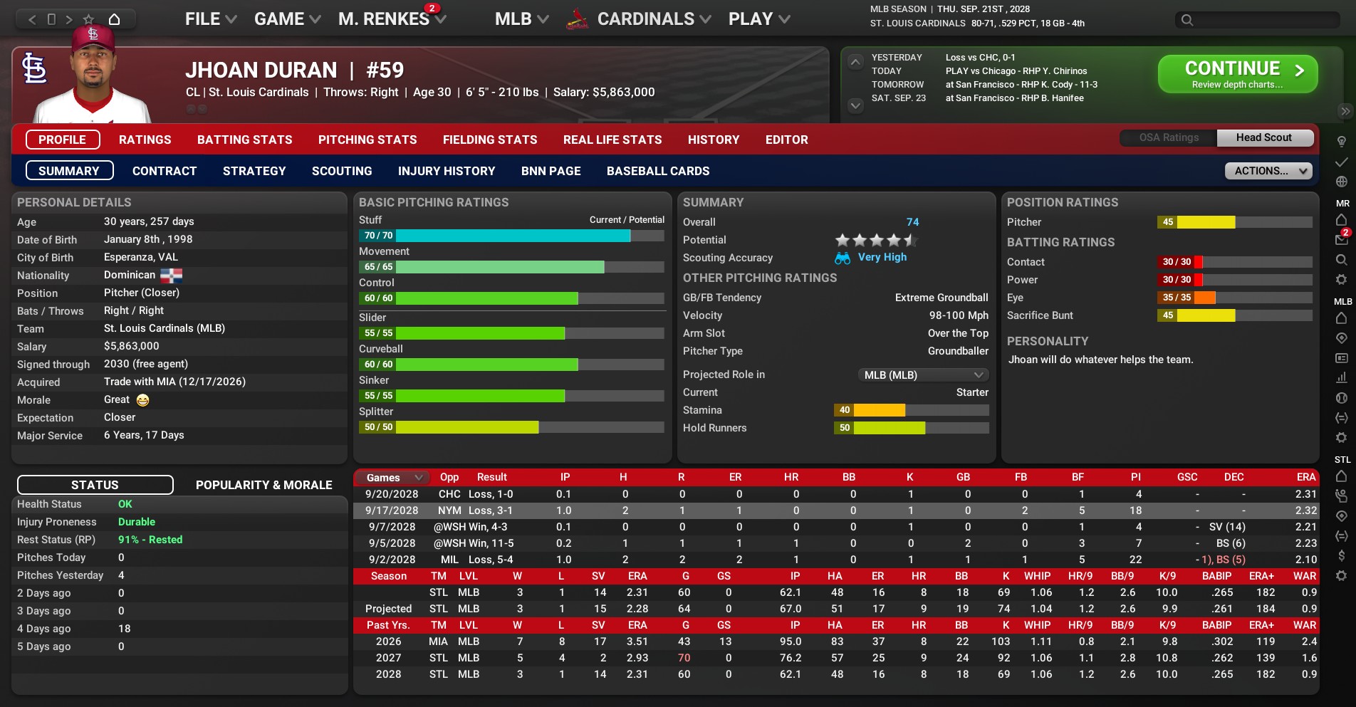 Acquired from the Miami Marlins prior to the 2027 season, Duran has pitched in 130 games for the Cardinals going 8-5 with 16 saves and a 2.65 ERA. He has served as the team's closer since the All-Star break in 2028. This season, he has worked in 60 games going 3-1 with 14 saves and a 2.31 ERA. The 30-year-old will make $6.5 million next season. The 2030 season will see him with a $7.5 million salary, which includes a team opt out. |