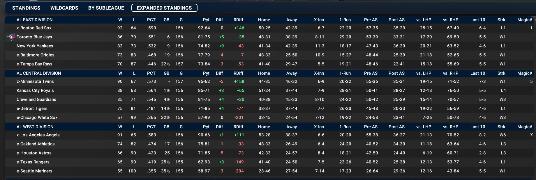 At 90-67, the Twins own a 1.5-game lead over the Kansas City Royals in the American League Central Division with five games remaining in the regular season. The best overall record in the AL also remains up for grabs as AL East-leading Boston is 92-64 and the Los Angeles Angels top the AL West at 90-65. A division title would be the second in a row for Minnesota, which defeated the Giants in the 2027 World Series. |
