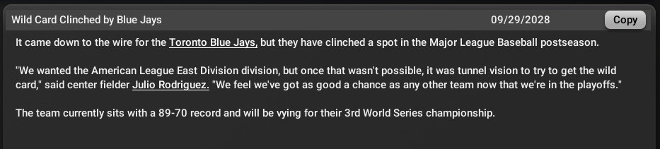 A 22-3 rout of the New York Yankees assured the Blue Jays a berth in October. Toronto (89-70), which trails Boston by six games in the AL East with three games to go, sits a game in front of Kansas City for the top seed among the three wild cards. It is the fifth straight trip to the playoffs for Toronto. The Jays last made the World Series in 1993, when it capped the second of a back-to-back title runs. |