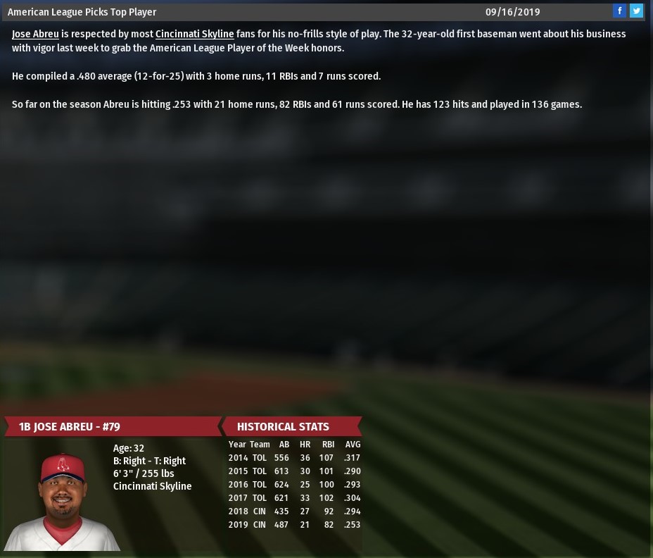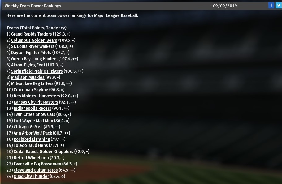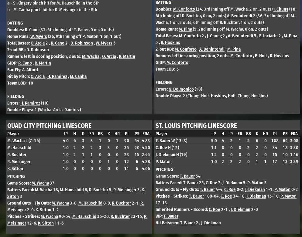 With the sweep, the NL North Division leading Muskies pulled to within a game of the River Walkers for best record in the National League. The loss also means that St.Louis' lead in the NL South is down to 4.5 games over Des Moines with 14 games remaining. Brad Boxberger was the first St. Louis reliever to get bounced around in the ninth. He retired two of the first three batters he faced before falling apart. The big one was a two-run double from Chase Headley which tied it at 3. Jake Diekman, who came into the inning slightly fatigued but the entire bullpen was tired outside of Chaz Roe who has not been able to get anyone out for three weeks, allowed a single to Brandon Nimmo before hitting both Francisco Lindor and Nomar Mazara and then walking Matt Olson to score another run. Out of options, Chaz Roe was given a chance and did just what I expected. He walked Nick Senzel to score another run. The late game meltdown spoiled a strong outing from Trevor Bauer. He went six innings, allowing one run on four hits. He struck out four and walked two. Madison starter D.J. Mitchell lasted just four innings, giving up two runs on three hits. But once again, Madison got a strong showing from its bullpen with -- Caleb Smith (2.0 IP), Justin Wilson (1.0), Jared Miller (0.1) Drew Steckenrider (0.2) and Zach Littell (1.0) -- combining to limit the Walkers to a single run the rest of the way. Littell earned his second save of the season in as many games. |