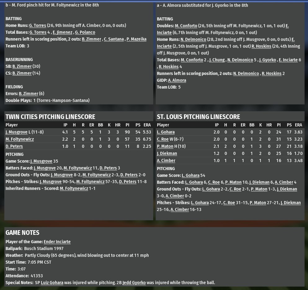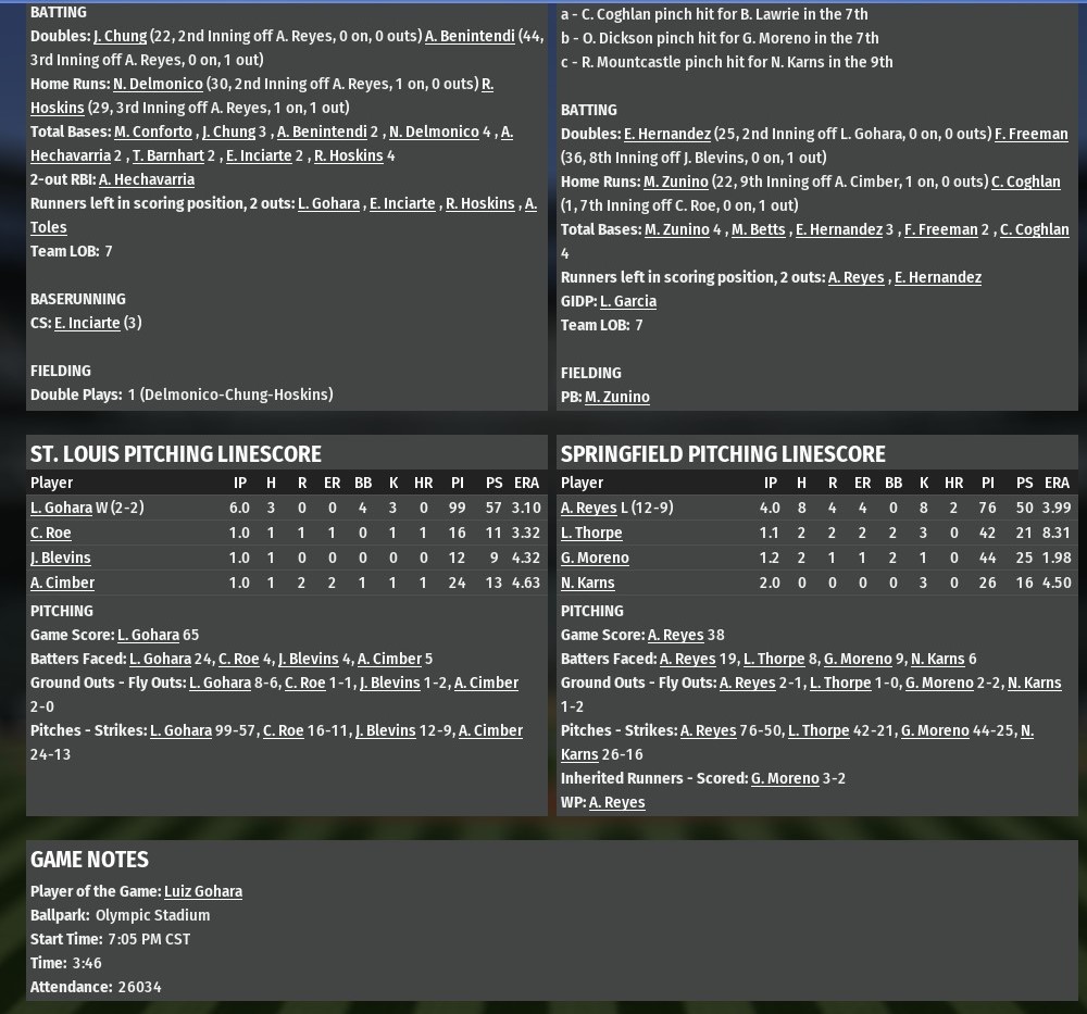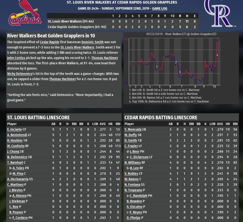 The contest was the opening game of a doubleheader. The River Walkers served as the home team in a road park as the original game was rained out in St. Louis. Hoskins first big hit was a two-run homer off Golden Grapplers starting pitcher Trevor Williams, staking St. Louis to a 2-0 lead. His second came in the third inning. It also came off Williams, and it was a single that put up the Walkers' 3-2 and gave them the lead for good. Jin-hwan Chung later plated Hoskins in the third, with a two-out double to make it 4-2. St. Louis starting pitcher Aaron Nola went six innings, allowing two runs on seven hits. He struck out seven and walked none. Three relievers (Phil Maton (0.1 IP), Bobby Poyner (1.2) and Reyes Moronta (1.0) combined to shut out the Grapplers the rest of the way. Chung was 2 for 4 with two RBIs. |