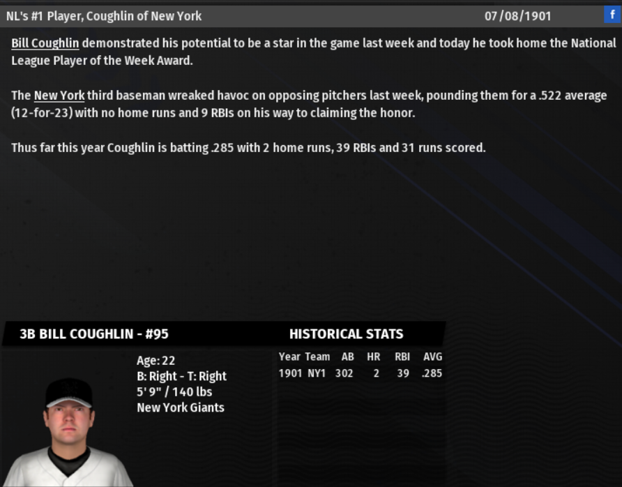 Bill "Scranton Bill" Coughlin came up big last week as the New York Giants 3rd baseman was named the National League Player of the Week. In earning the honors, Coughlin went 12 for 23 (.522) with 5 Doubles, 5 Runs, and 9 RBIs.