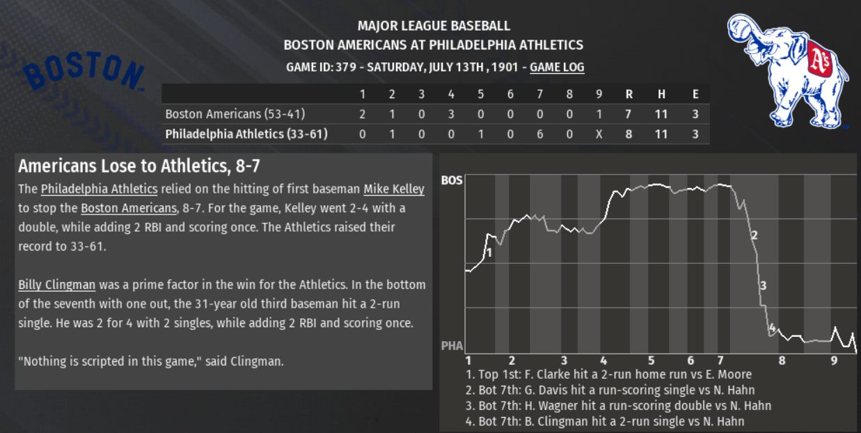 Game 84: While Boston (48-36) came away with the 3 to 2 win, the loss was not the fault of Baltimore (33-51) pitcher Ted Lewis (7-11) who pitched an outstanding game only to be done in by the poor defense (6 errors) of his team. Boston pitcher Cy Young (10-10) picked up the win, giving up 2 earned runs while striking out 6 and finishing with a Game Score of 67. Lewis' pitching line was 3 runs (0 earned) on 4 hits; Game Score of 68. John Farrell (2 for 4, 1 RBI) and Ossee Schreckengost (0 for 3, 2 RBIs) contributed to the offense, while Jimmy Bannon (3 for 4) and Jesse Burkett (2 for 4, 1RBI) efforts were done in the losing effort. Player of the Game: Cy Young (Season: #9 / Career: #9) Game 85: Baltimore (34-51) bounced back with the 3 to 2 win over the Americans (48-37), riding the arm of promising rookie Christy Mathewson (7-15). On the day, Mathewson allowed 2 earned runs on 7 hits and 1 walk, striking out 7 to finish with a Game Score of 71 and lowering his ERA to 2.91 on the season. Boston pitcher Fred Klobedanz (11-9) permitted 3 runs (1 earned) on 7 hits and 4 walks for a Game Score of 57. Jimmy Collins (3 for 4, 1 Run) and Barry McCormick (2 for 3, 1 RBI, 1 Walk, 2 Stolen Bases) powered the offense in the win, while Kid Elberfeld's efforts (2 for 4, Double, Triple, 1 RBI) and Win Mercer (1 for 3, Triple, 1 RBI, 1 Walk) were wasted. Player of the Game: Christy Mathewson Game 86: This one got away from Boston (48-38) quickly, as Baltimore (35-51) jumped out to an early lead and never looked back. Oriole pitcher Wiley Piatt (8-11) picked up the win in the 7 to 4 victory, allowing 4 earned runs on 7 hits and 2 walks, striking out 6 to finish with a Game Score of 61. Noodles Hahn (14-10 was roughed up, lasting 7 innings due to giving up 7 runs (6 earned) on 11 hits and 3 walks, striking out 9 for a Game Score of 35. Reliever Effie Norton tossed a scoreless 8th inning in which he allowed 1 hit. Five Baltimore batters had 2 hits on the day, led by Otto Krueger (2 for 4, Double, 1 Run, 2 RBIs), Jesse Burkett (2 for 4, 1 Run, 2 RBIs), and Wiley Piatt (2 for 4, 1 Run, 2 RBIs). For the Americans, Frank Chance (2 for 4, 2 Doubles, 1 RBI) and Fred Clarke (2 for 4, Triple, 2 Runs) were solid at the plate. Player of the Game: Wiley Piatt