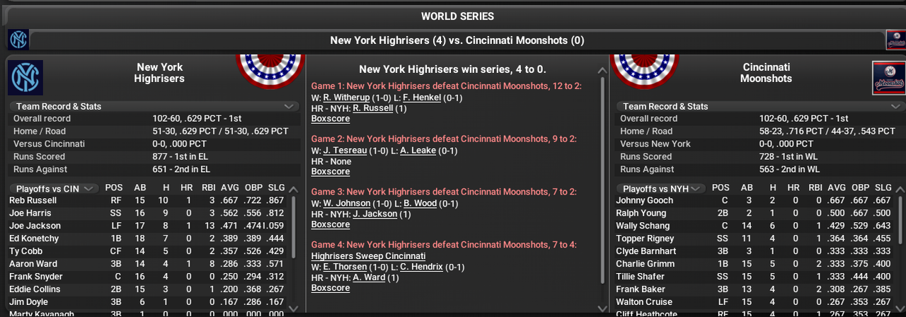 The New York Highrisers beat the Cincinnati Moonshots 4-0 in a clean sweep. Joe Jackson hit .471 and Reb Russell hit .667 (10 for 15) as the Highrisers dominated. For New York it is their 4th World Series crown after a three year run from 1914-1916.