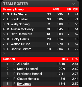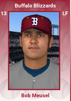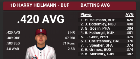 It appears that San Francisco's run of 4 straight Western League championships is going to come to an end. The team that is up 10 games on them is the Cincinnati Moonshots. Cincy never seems to win 2 pennants in a row but have popped up in 1902, 1913 and this year to field very strong teams. This year's crew is balanced from top to bottom. Dutch Leonard, 3-time Ace Award winner with Cambridge, has 20 wins but overall, it is a balanced club. 24 year-old Austin McHenry is having a great season - he met an early demise in his real life.