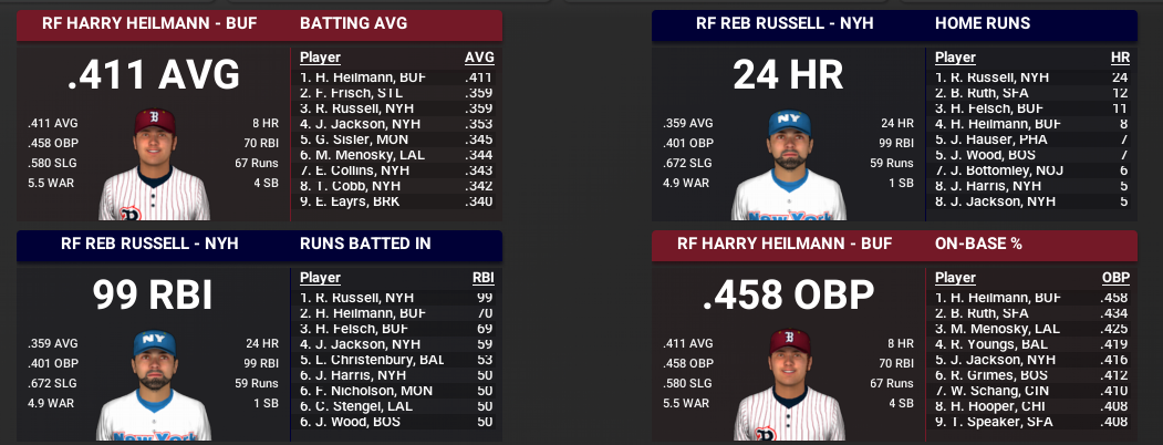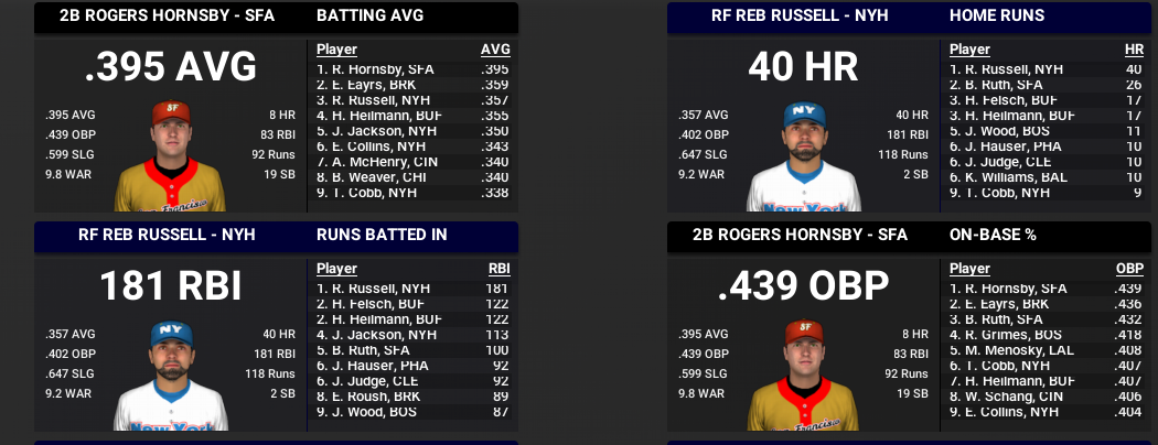 An historic year for Reb Russell as he hits 40 home runs and knocks in 181 runs, easily all-time highs in both categories. Babe Ruth finishes with 26 round trippers. Rogers Hornsby flirted with .400 but dropped just below in the final days.