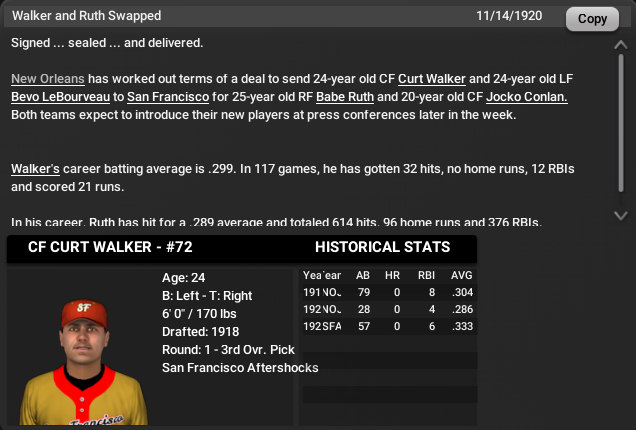 A big offseason trade as Babe Ruth is traded by San Francisco to the worst franchise in WBL history, the New Orleans Jazzcats. The Aftershocks get Curt Walker in the deal. Meanwhile, Reb Russell continues to be the WBL's own "Babe Ruth" as he follows up a 40 HR campaign with 13 homers in April.
