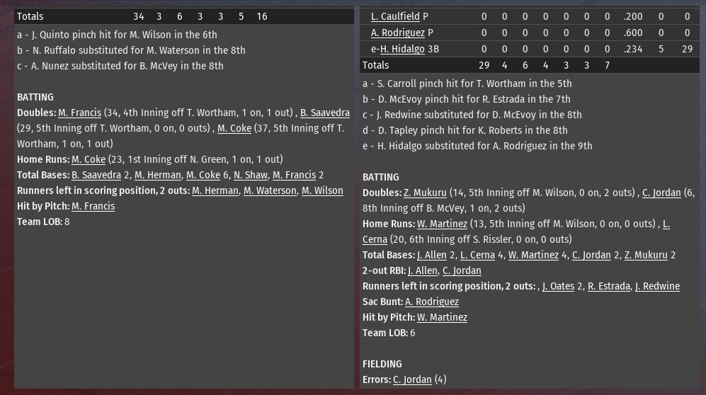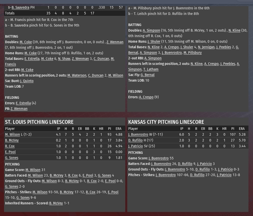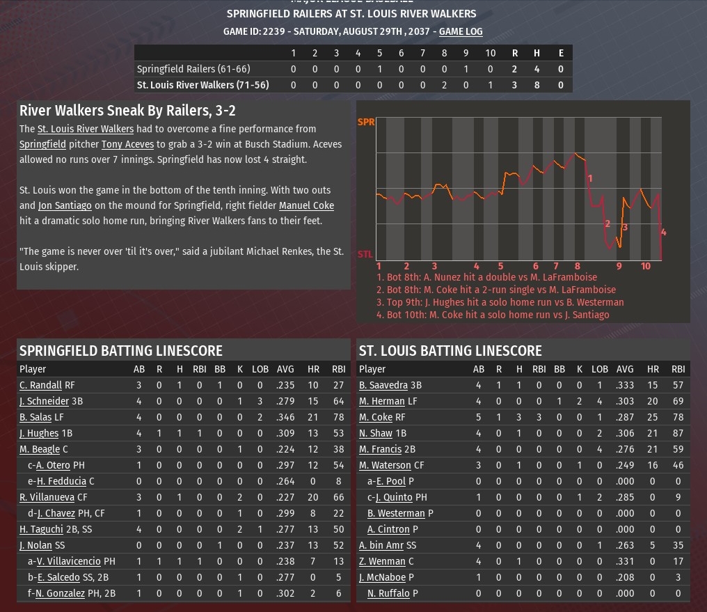 Manuel Coke homered with two outs in the bottom of the 10th inning off Springfield reliever Jon Santiago to give St. Louis a 3-2 win at Busch Stadium (2006). The homer came on an 0-1 pitch and soared 429 feet over the right-field wall. It was the third consecutive game Coke has homered. In the previous two, Coke had hit two-run homers in the first inning. The Railers had forced extra innings by tying the game in the top of the ninth on a one-out homer by Joseph Hughes off River Walkers closer Bobby Westerman. It marked the ninth blown save of the season for Westerman, tops in the MBL. Down 1-0, St. Louis had taken a brief lead by scoring twice in the bottom of the eighth. Alex Nunez led off with a single off Railers relief pitcher Mike LaFramboise. Bob Saavedra followed with a single to put runners at the corners. A ground out by Mark Herman moved Saavedra to second. Coke scored them both with a single to left-center. Jesse McNaboe turned in one of his best starts of the season for the Walkers, allowing one run on three hits over six innings. He struck out three and walked two. Nick Ruffalo and Elvis Pool both pitched scoreless innings to get the game to the ninth. Westerman got two outs in the ninth before leaving for Armando Cintron. Cintron (3-0) finished the ninth and set the Railers down in order in the 10th to set himself up to earn the win. |