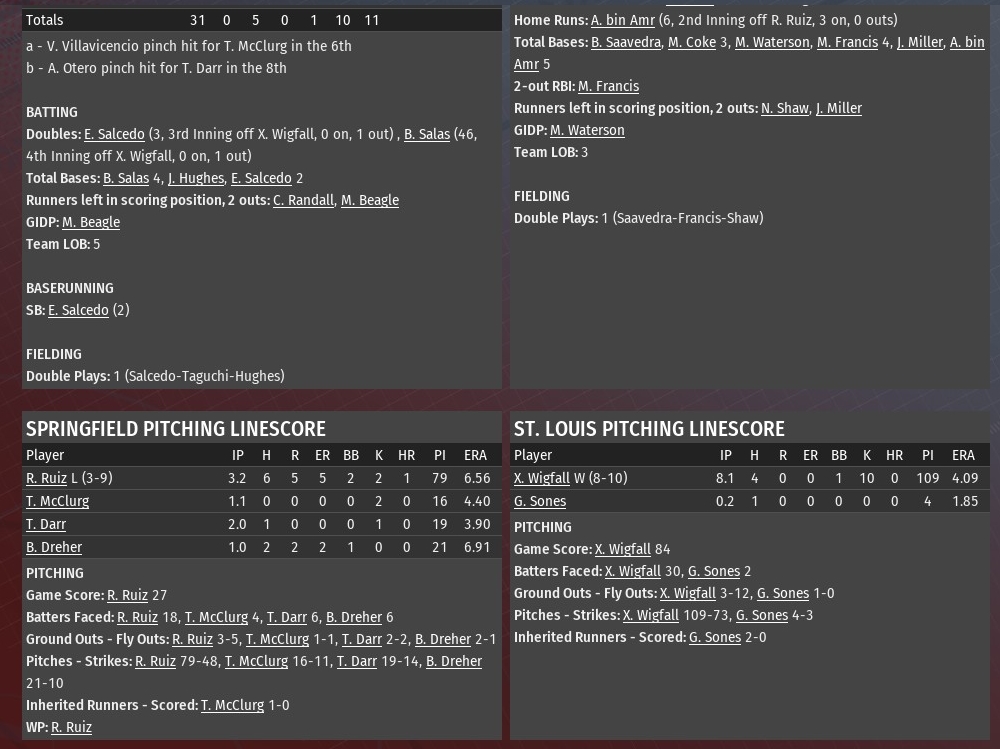 Xavier Wigfall came within two outs of a shut out but the St. Louis bullpen finished the job as the River Walkers downed Springfield 7-0 at Busch Stadium (2006). The win gave the Walkers a three-game sweep and a four-game win streak. Wigfall (8-10) allowed just three hits over a scoreless first eight innings, but when he allowed a walk and a hit in the ninth (along with throwing his 109 pitch) it was time for him to exit. The right-hander also struck out 10 and walked just one in his time on the mound. Greg Sones took over for Wigfall and although he gave up a hit to load the bases he did manage to preserve the shutout. Wigfall's exploits overshadowed a huge game at the plate for Abdul-Nasser bin Amr, who drove in St. Louis' first five runs of the game. The 27-year-old shortstop made it 4-0 in the bottom of the second when he hit a grand slam off Railers starting pitcher Ruben Ruiz. Two innings later, with Marcos Francis on third, bin Amr got down a bunt to score Francis and make it 5-0. Francis drove in the final two Walkers' runs in the eighth with a two-run double off Brent Dreher. |